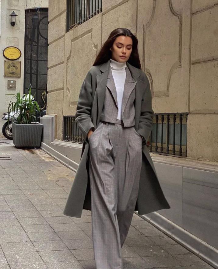 外套+外套的疊穿,可以說是最合適秋冬季節的了,灰色雙面大衣,今年很流行這種款式,內搭一套灰色西裝套裝,輕鬆營造出幹練利落感,也很不失氣場,西裝套裝裏面還內搭了一件白色高領毛衣,可太保暖了,營造出剛柔並濟的感覺,讓穿搭更颯更時尚。