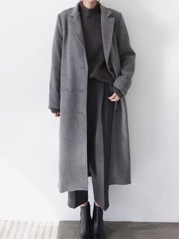 對於灰色的長大衣,真的是一點抵抗力都沒有,這一件雙面款式的灰色大衣,看起來也太有範了,內搭一件灰色針織毛衣,可以將女人的自信和氣質完全呈現出來,搭配一條灰色闊腿褲,整個着裝給人的感覺很高級,選擇一雙黑色靴子,走起路來都帶氣場。
