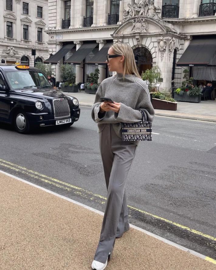 灰色針織毛衣,很簡單基礎的款式,搭配一條灰色闊腿褲,輕輕鬆鬆就打造出大女人的獨立魅力,也將個人的魅力和幹練氣質呈現出來,搭配上一雙運動鞋,整體看起來有種利落率性感。