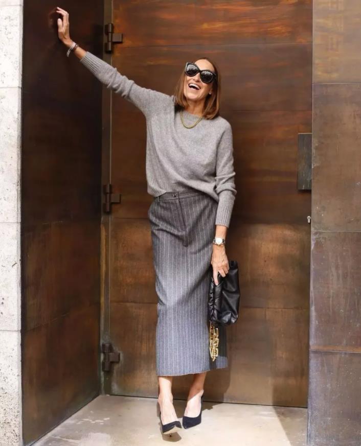 灰色羊毛針織衫,在秋天直接單穿就行了,特別適合現在南方的天氣,搭配一條西裝條紋闊腿褲,上簡下繁的組合,增加層次又時髦。整個着裝散發出一種知性,滿滿的魅力氣息,針織衫全部塞進褲子裏面,又多了幾分利落和幹練,穿出大女人的自信和灑脫,也盡顯無拘無束感。