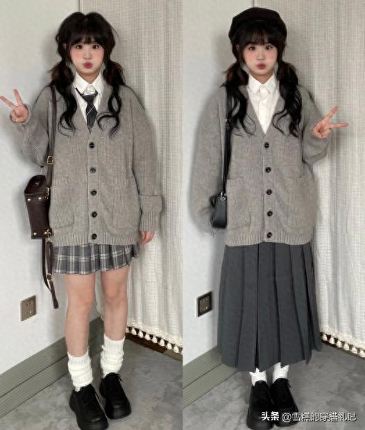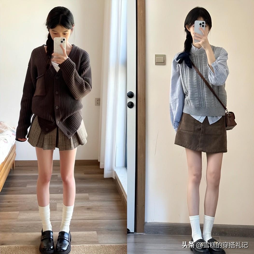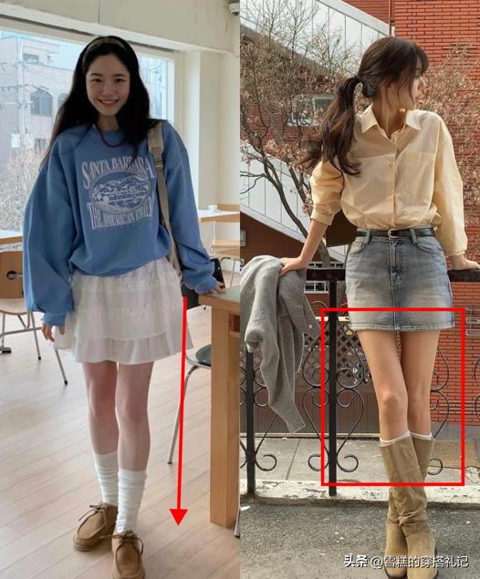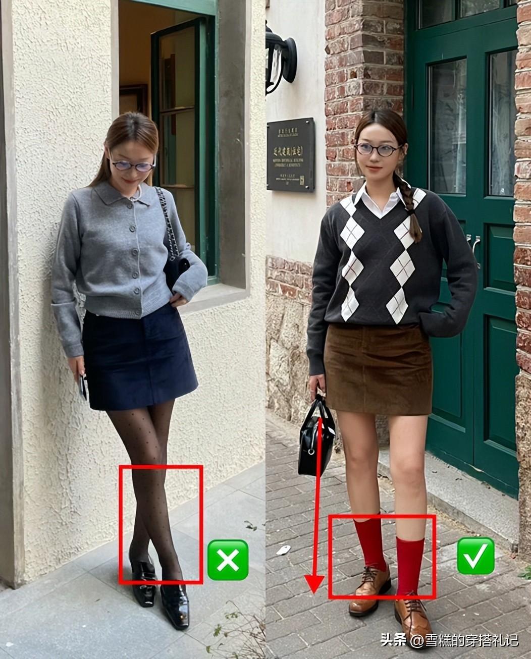 因爲短裙會露出大面積的腿部肌膚,對於腿型比較好的女生還友好。而腿型不直的女生會有暴露缺點的問題。這時候可以借用襪子的款式來修飾缺點,儘量不要選擇修身的連體襪,它會放大腿不直的問題。採用中筒襪,且襪子的表面帶一點堆疊感,能增加寬度減少視覺腿型的外翻。