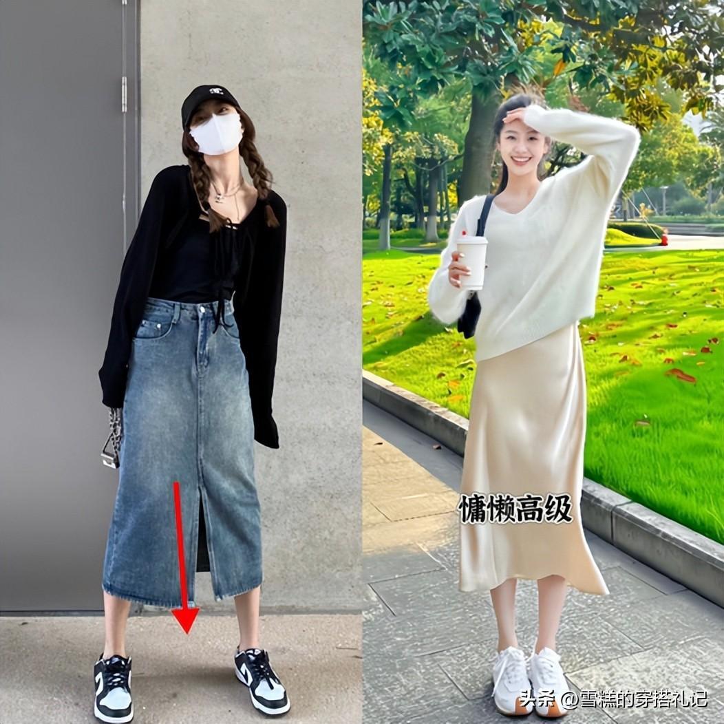 其實近幾年美式復古、千禧風的潮流,出現很多多在膝蓋位置長度的裙子,並且還帶有低腰的設計,這種款式對於矮個子女生來說簡直就是災難,它會讓自己的下半身變成四分長,腿部視覺上截斷,顯得小腿尤其粗,這種裙子相對於又瘦又高女生更友好,但也需要有好的穿衣品味才能打造出好看的效果。
