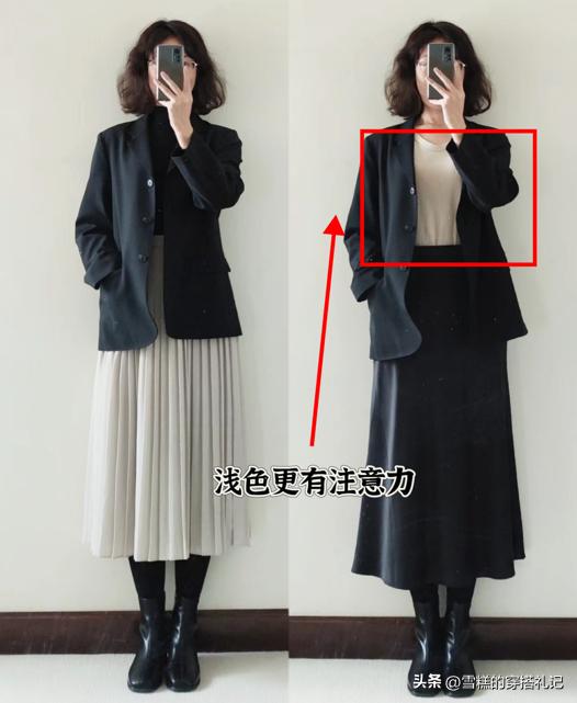 另外一種是通過顏色的對比來做到視覺重心的上移,常見是是穿搭中深淺色的對比,讓淺色集中在上半部分,它更容易吸引人的注意力,深色它具有視覺弱化的作用,放在下半身才合適。