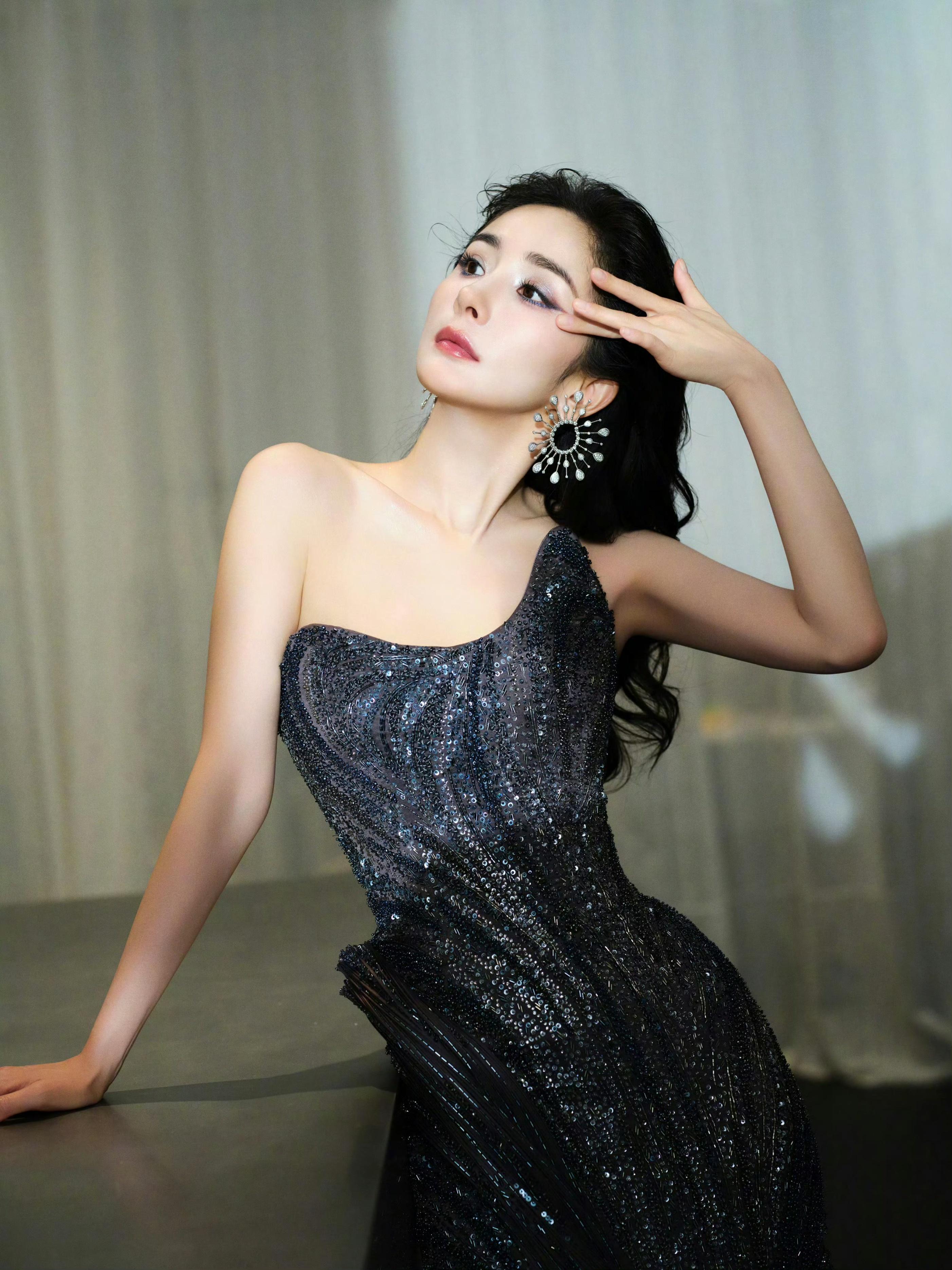 雖然玩的是抽象派,但是楊冪的妝造真的沒話說。她選了閃着光芒的流線裙,搭配了高顱頂的披肩發,顯得她髮量超多,滿是青春感。