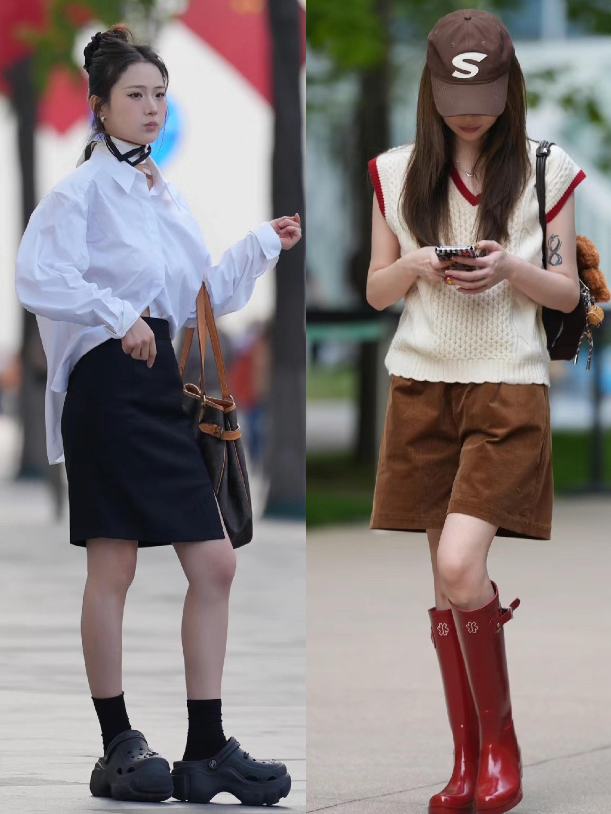 這種搭配,並不是嚴格意義上的下衣失蹤。畢竟前面的襯衫塞了衣角,算得上是改良版的下衣失蹤吧,配一雙厚底的洞洞鞋也顯高。