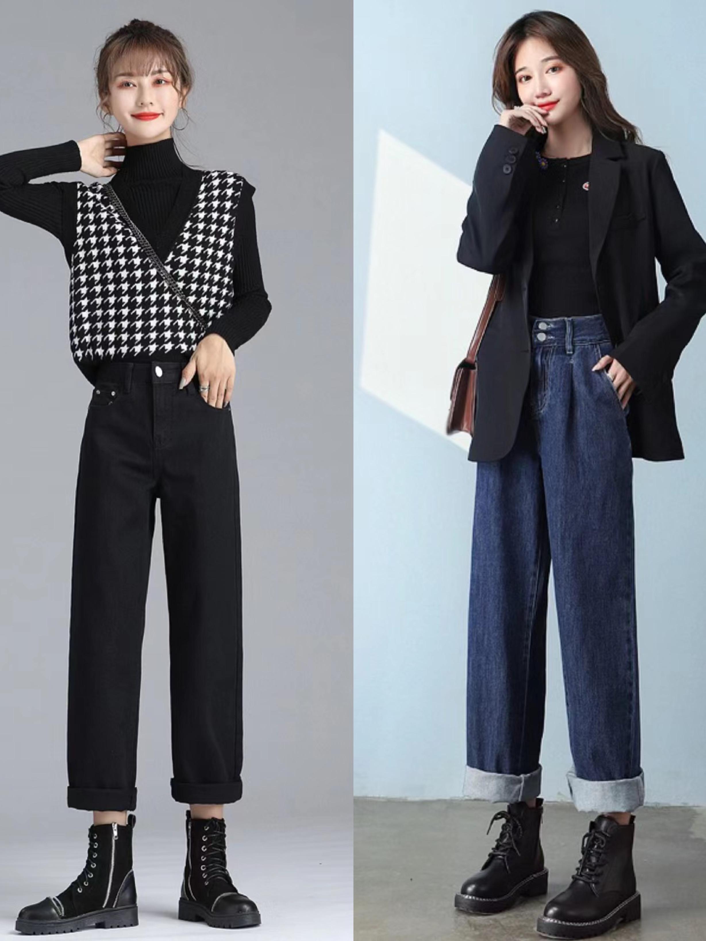 秋天裏,可以配老爹褲的短上衣實在太多了。黑色的針織衫+短款的馬甲,保暖又洋氣、層次感也更足。