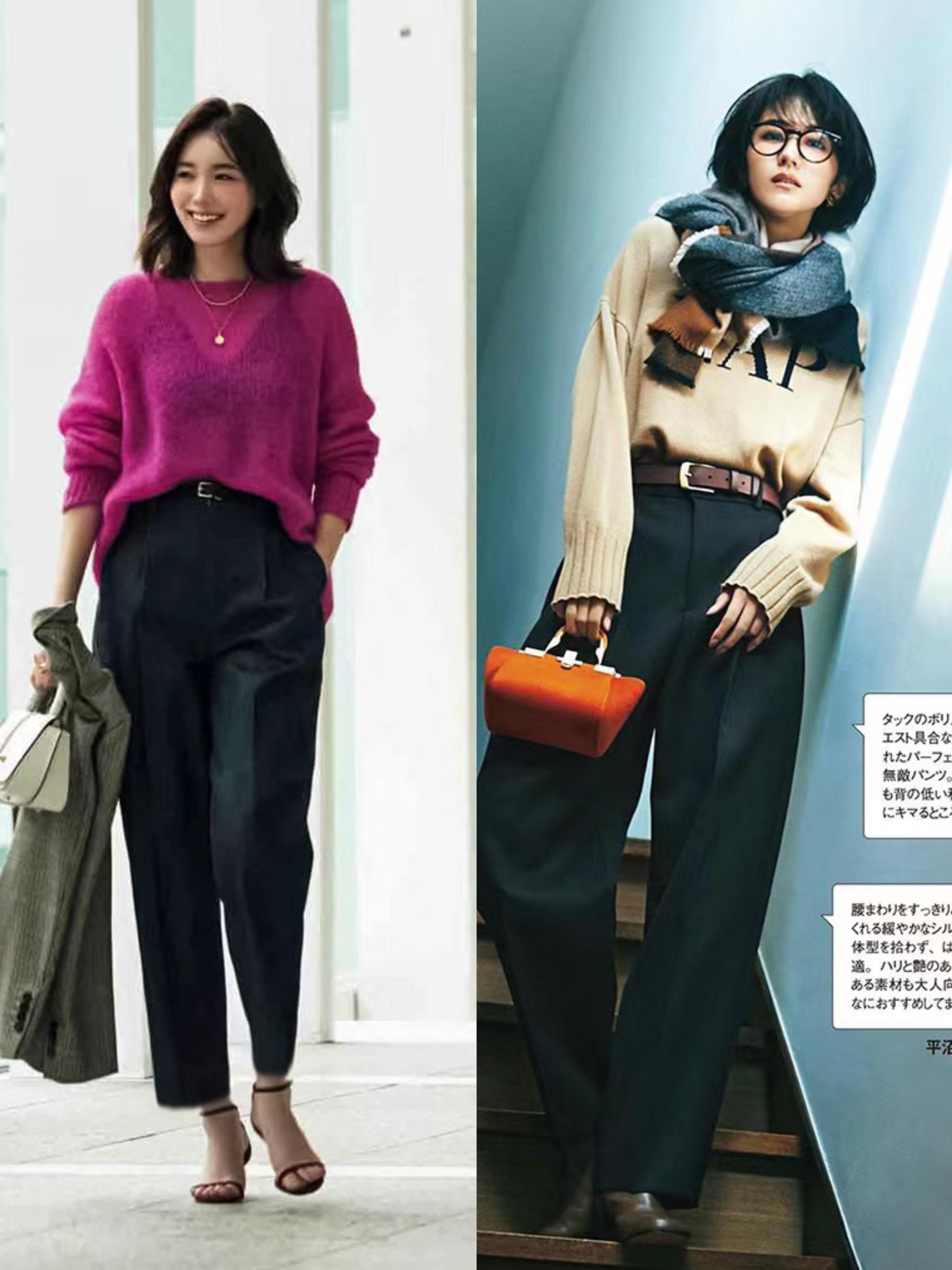 一種更加適合輕熟齡、或者大齡女性的穿搭模板,寬鬆的針織衫配上老爹褲,優雅大方、上班通勤氣場在線。