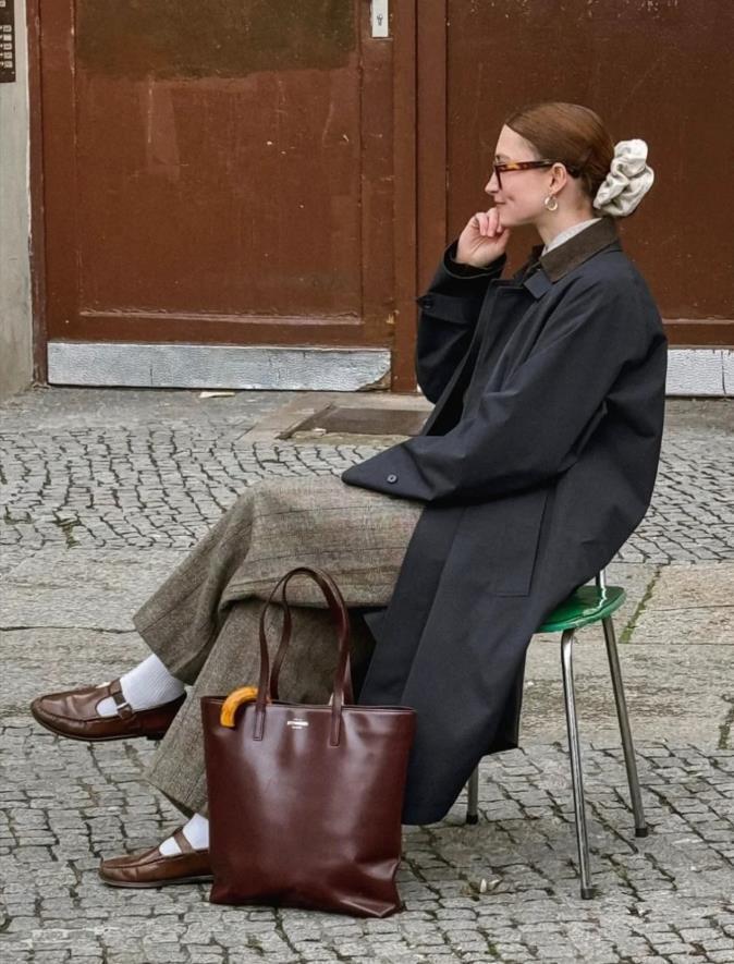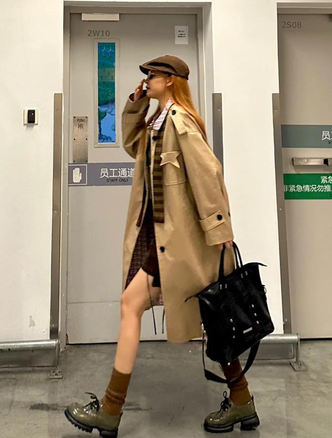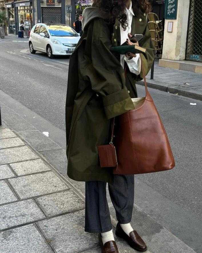 秋冬就是風衣的主場,充滿氛圍感復古風的風衣,疊穿了綠咖色的內搭,完美詮釋了美拉德風,配上英倫風皮包,再搭配上一雙綠色皮鞋,利用棕色堆堆襪進行點綴,一秒就塑造出英倫風。