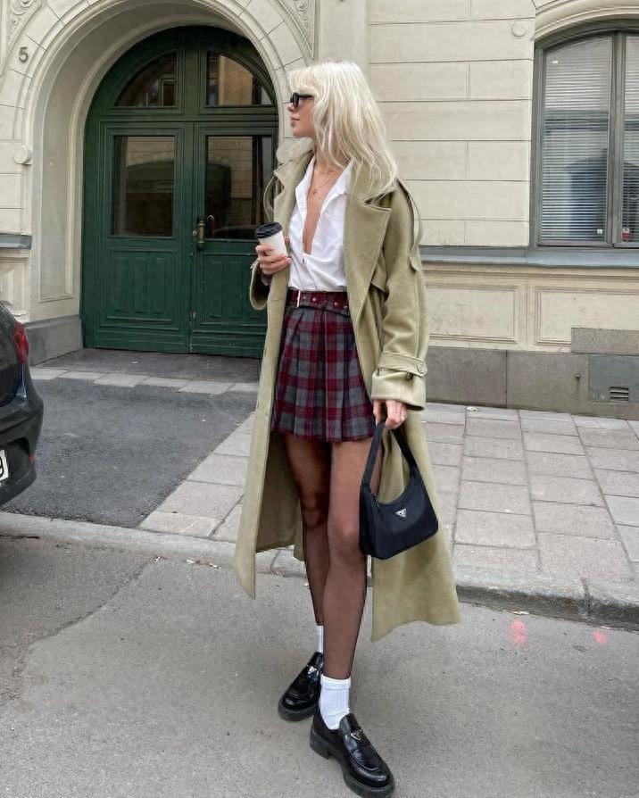 這一套穿搭妥妥的英國電影女主的既視感,一股濃厚的知識分子風,可正式也可休閒,不管是日常通勤,還是休閒都不會出錯。黑色風衣+格紋闊腿褲,休閒隨性還帶着幾分慵懶的味道,腳下踩着一雙咖色樂福鞋,穿起來很舒適自在也十分大方。