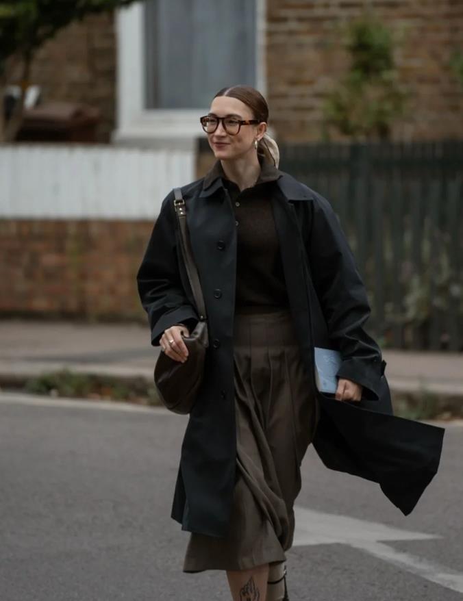 黑色的中長款風衣,真的是太經典百搭和耐看了,寬鬆的版型,對身材是一點違和感都沒有,內搭深咖色針織衫,秋冬的氛圍感直接拉滿了。搭配一條百褶半身長裙,自帶優雅氣質又不失氣質,腳下踩着一雙樂福鞋,可舒適自在了。