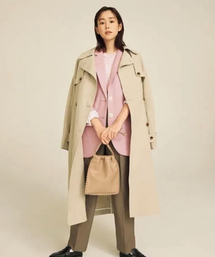 卡其色是一種很百搭的色調,與任何一種顏色組合一起都是非常不錯的,卡其色風衣搭配粉色西裝外套,毫不費力就能穿出大女人的氣質。搭配上一條深灰色西裝闊腿褲,很好彰顯出秋天的時髦與個性,搭配上一雙黑色樂福鞋,簡約卻不失簡單,兼顧了剛柔並濟的美。