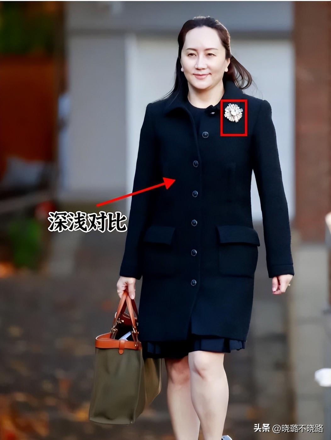 配飾顏色的選擇並不需要跟服飾之間有相呼應的效果,這樣配飾就做不到視覺體量的作用。顏色上要和服飾形成對比色,最佳的呈現方式是深淺的對比,孟晚舟穿深色的制服裙,搭配亮色的胸針,讓穿搭簡約不簡單,整個搭配有層次效果,亮色的胸針也化解了深色衣服的沉悶,不用擔心顯老氣的問題。