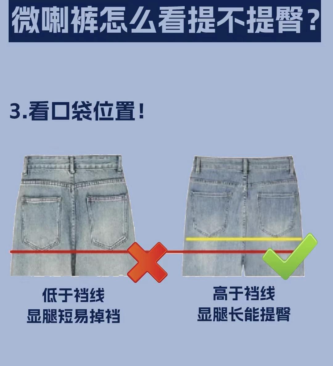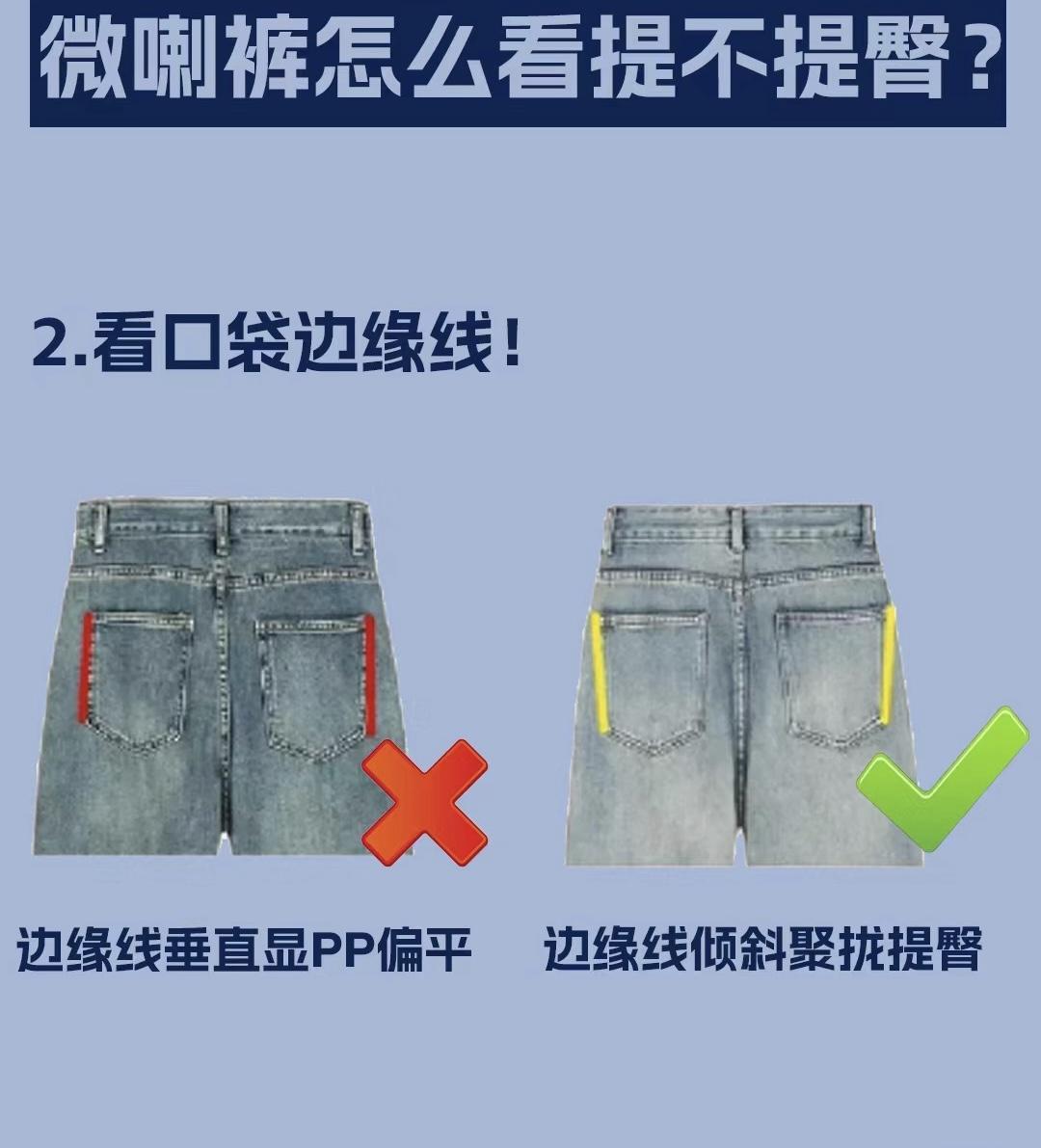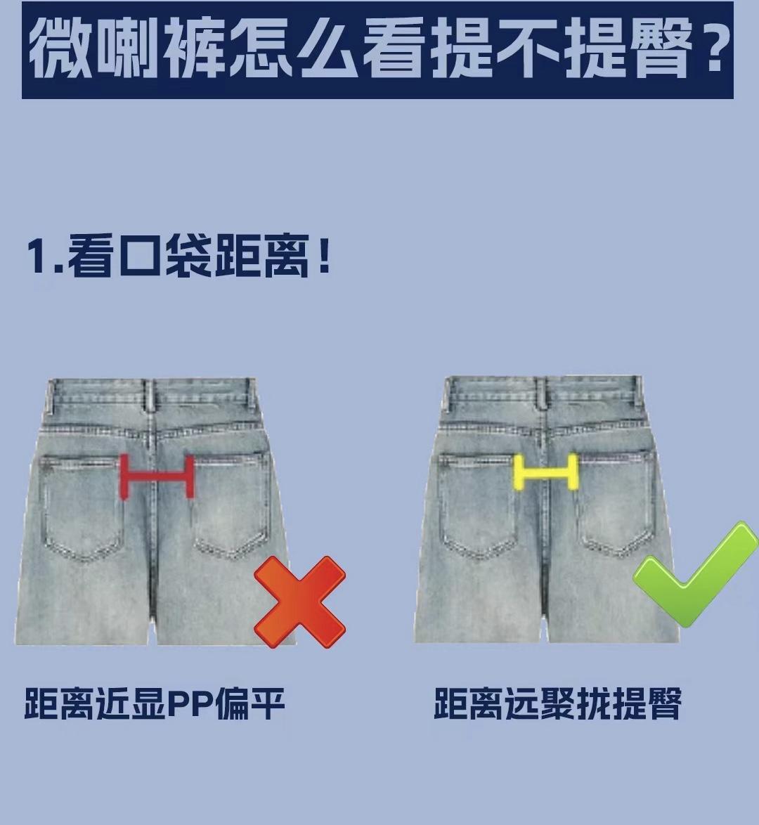 想要擁有提臀效果的微喇褲,主要還是看屁股口袋的設計。屁股口袋之間的距離越遠,提臀效果就越明顯。如果屁股口袋距離很近,就會顯得PP扁平。