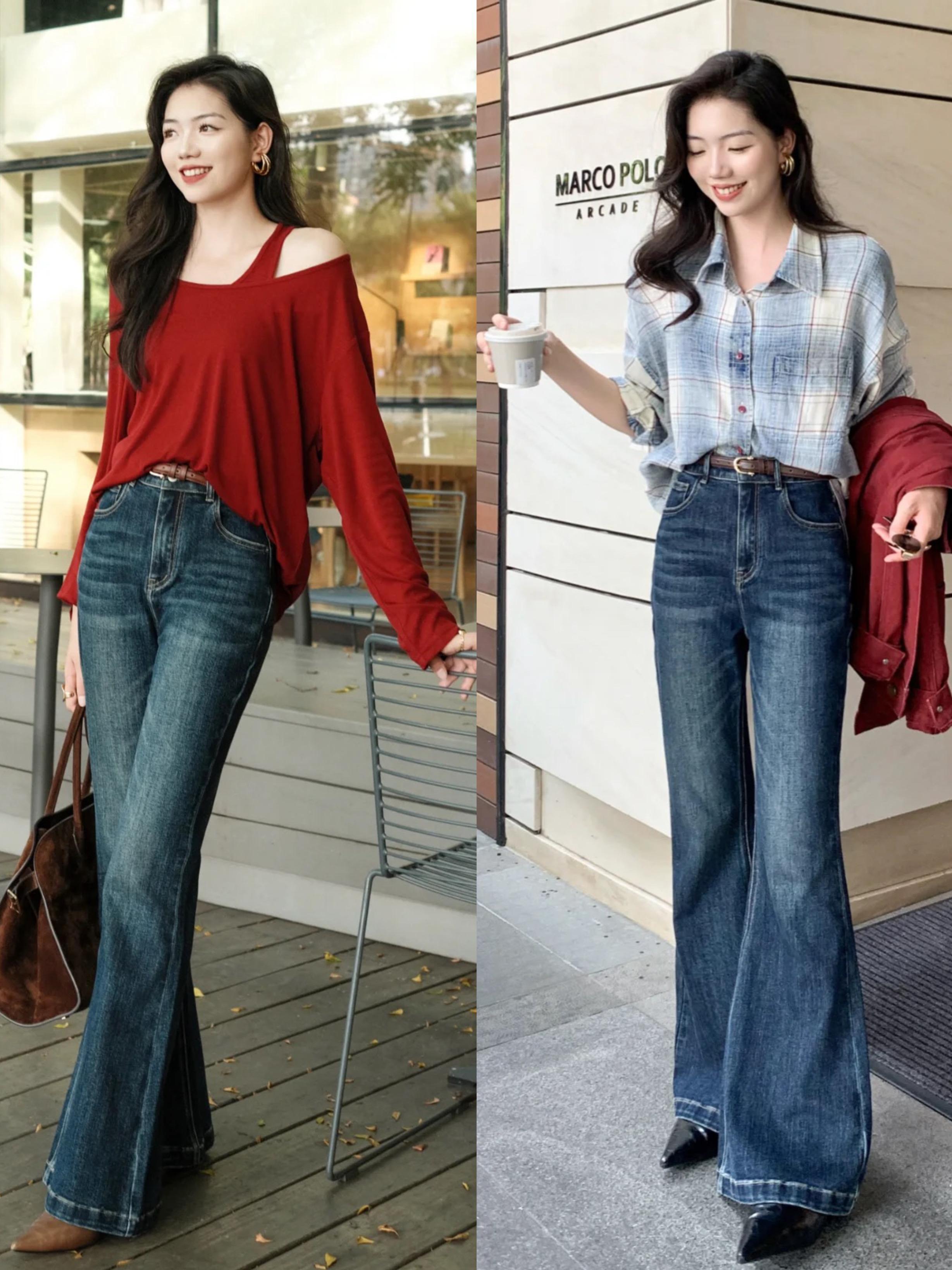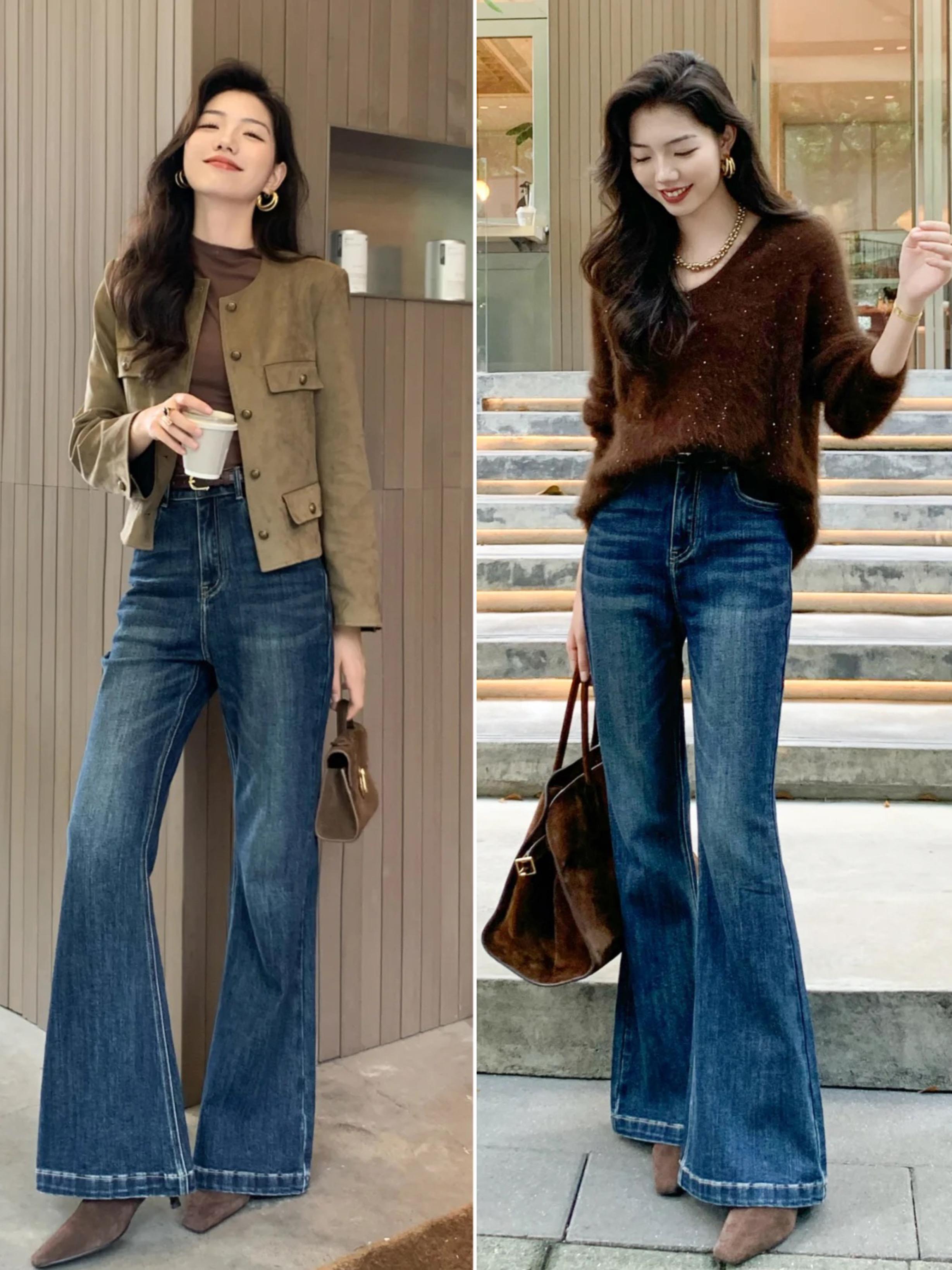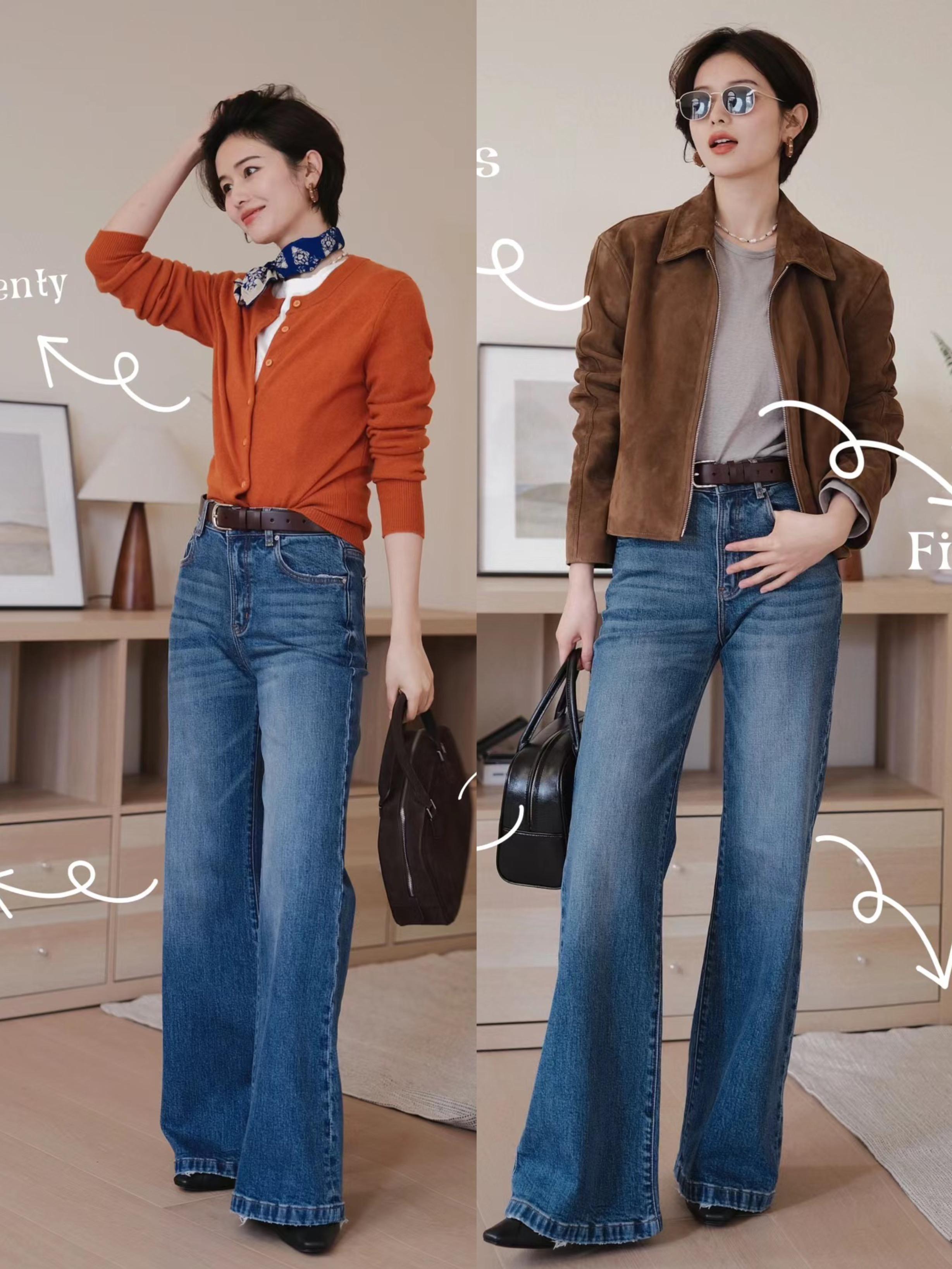 秋天裏的馬蹄褲,自然是以牛仔褲居多。尤其是復古藍的微喇牛仔褲,帶着年代感、防風又保暖。