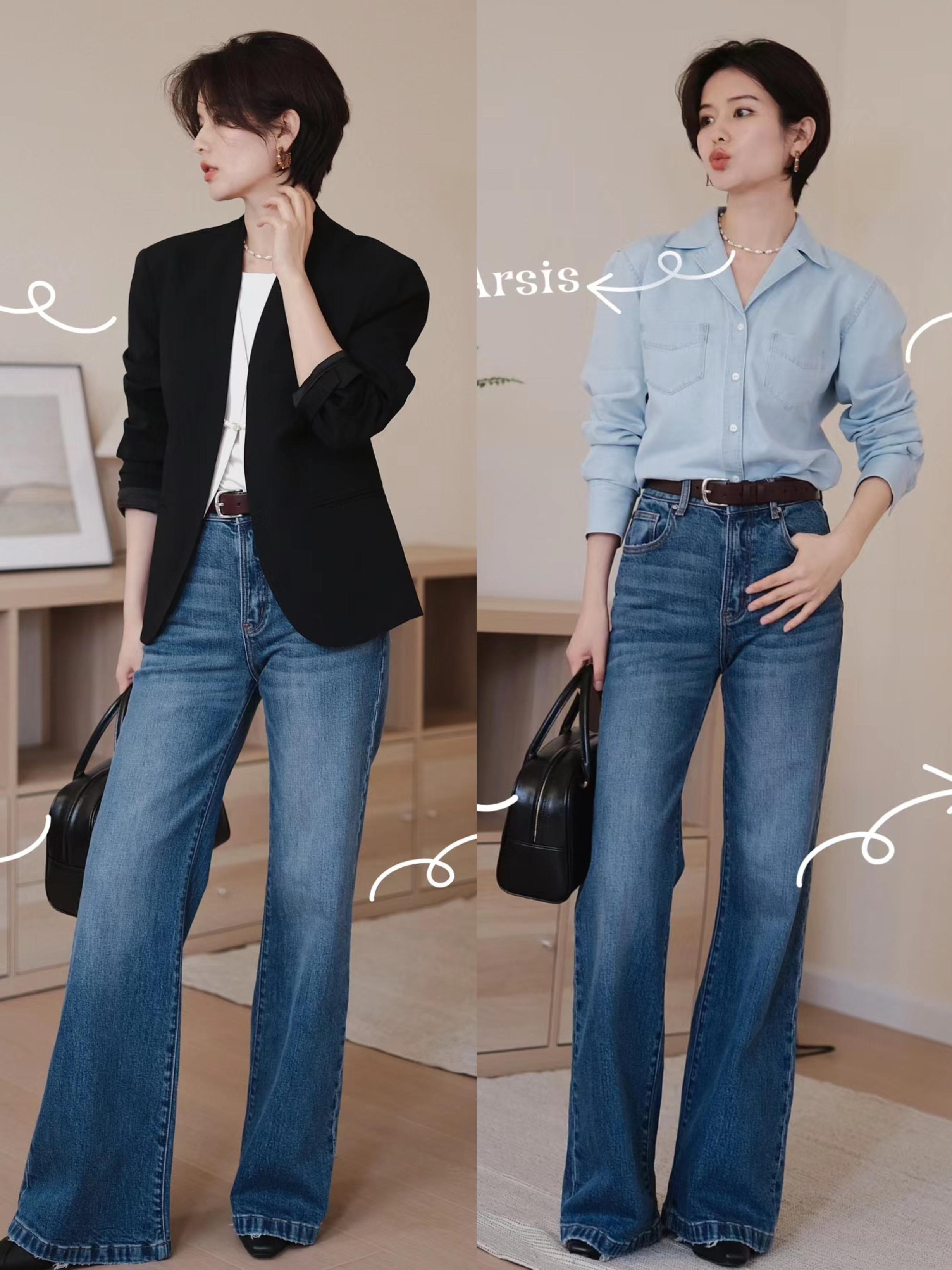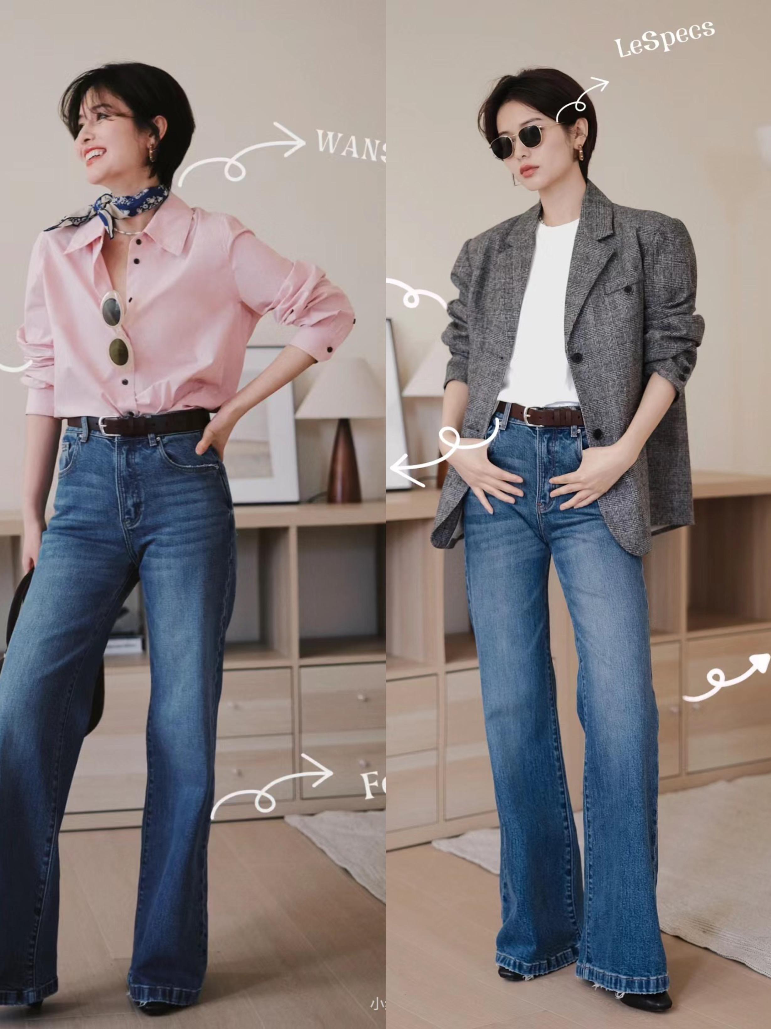 帶着幾分英氣,簡潔又幹練的穿搭,真的是太讓人喜歡了。淺藍色的襯衫、深藍色的微喇牛仔褲,利落又有範。