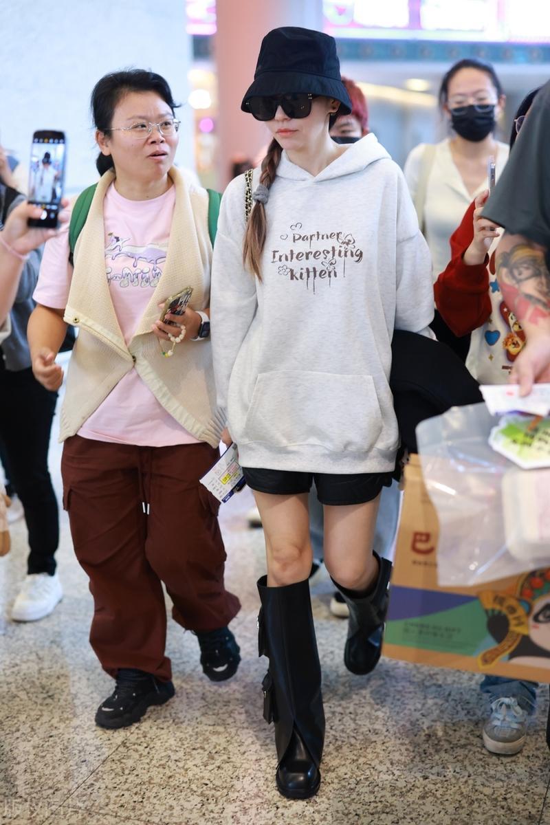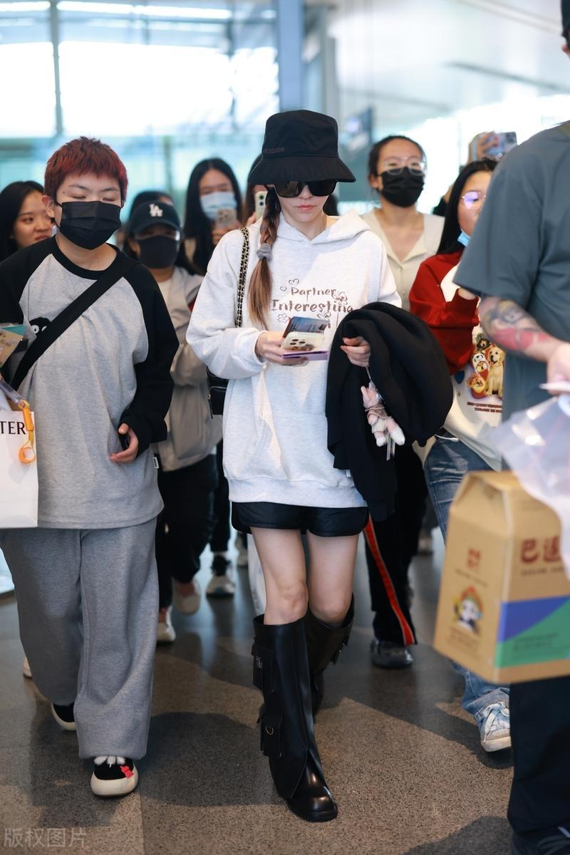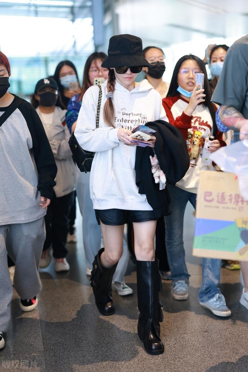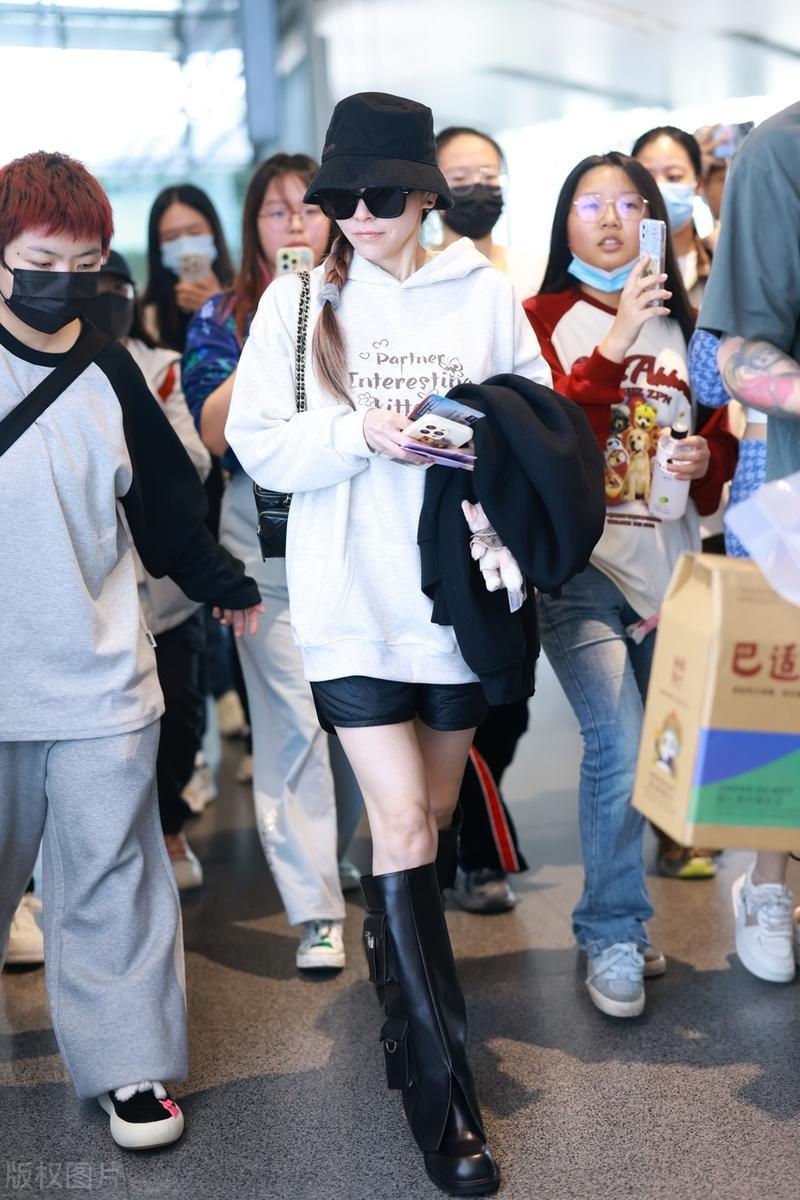40歲的張靚穎走機場,隨便一件衛衣配長靴,就輕鬆秀出了大長腿。雖然下衣失蹤的穿搭早就被玩膩了,但是在張靚穎身上有一種煥然一新的味道。
