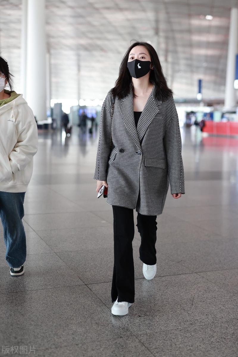 張靚穎的秋季穿搭,其實還有很多值得借鑑的地方。比如寬鬆的格子西服來搭配微喇的小黑褲,簡潔又高級。