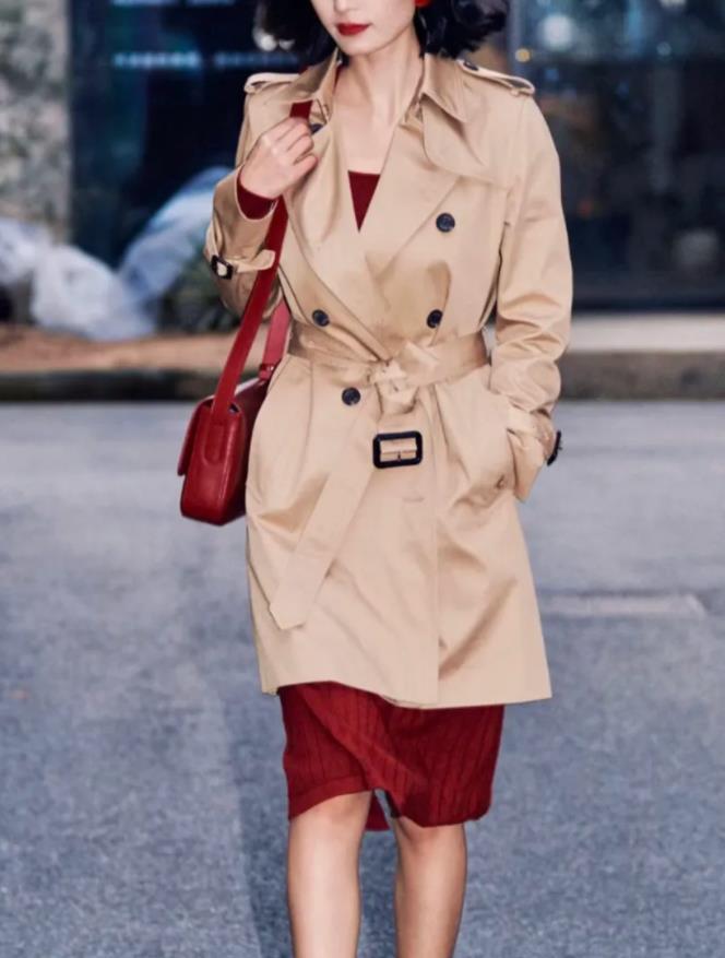小個子女性在選擇風衣時,稍微注意下長度,選擇中長款更合適,經典的卡其色,真的很百搭耐看,內搭一件深紅色針織連衣裙,完美展現出你的衣品,也將女人的自信和氣質都呈現出來,整個穿搭讓人感覺到簡單卻不平凡,知性與魅力並存。