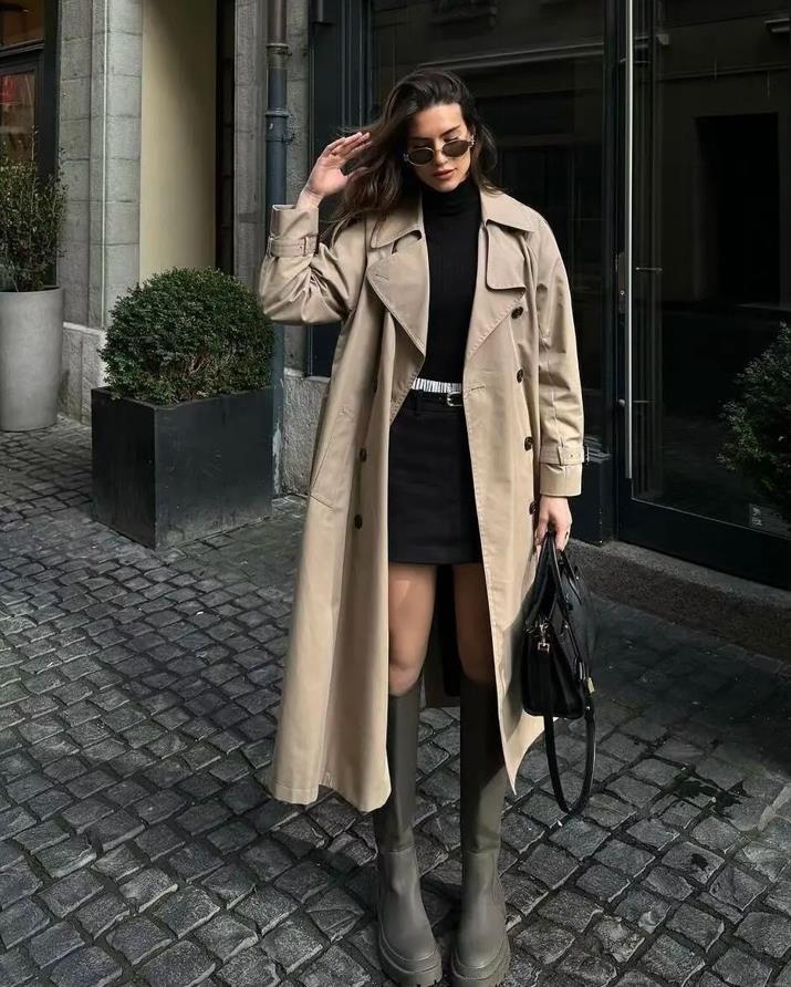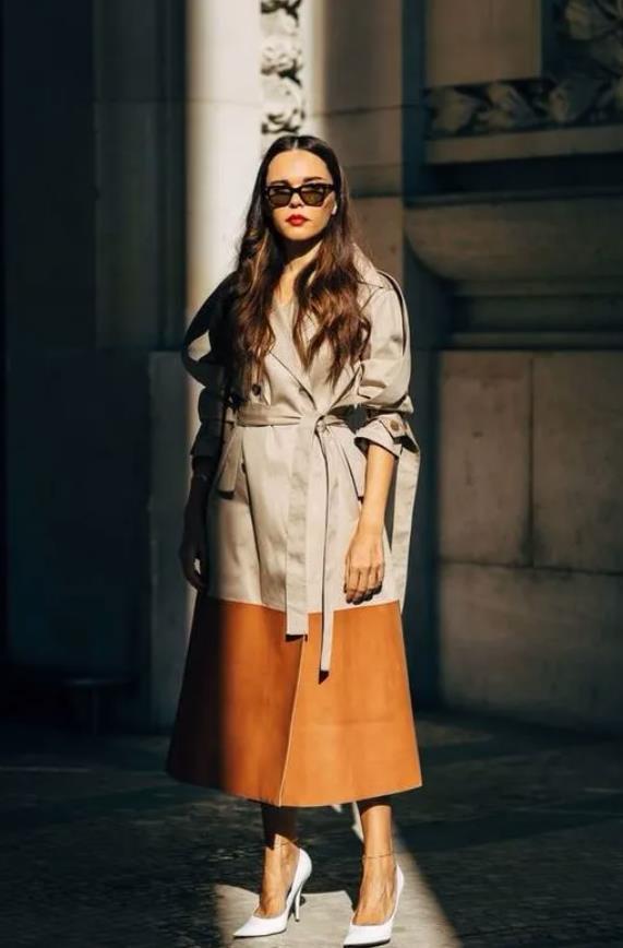 秋冬季節,風衣也是非常受歡迎的單品,選擇與裙子來配,就能將屬於女性額魅力和氣質都呈現出來,同時也非常時髦好看,適合各個場合的穿搭。