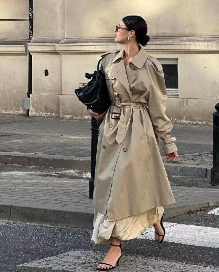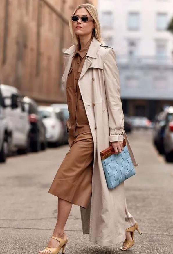 沒有人會拒絕卡其色風衣的吧?這一件低飽和度的淺卡其色風衣,真的太顯氣質和好看了,內搭深咖色的襯衫半裙,這樣的穿搭在視覺上是非常有辨識度的,很自然好看的搭配,選擇一雙高跟涼鞋,毫不費力就展現出高級和氣質,輕鬆應對各種場合。
