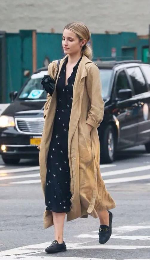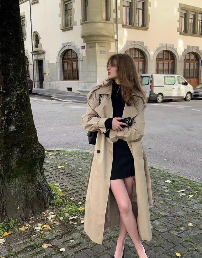 無論在什麼時候,卡其色的風衣都是最不會過時的一種款式,卡其色風衣,內搭一件黑色連衣裙,卡其色+黑色的配色組合,可太氣質了,也可以將女人的氣質穿出來,也散發出一種鬆弛和自在,搭配一雙黑色樂福鞋,穿出了幾分舒適和自在。