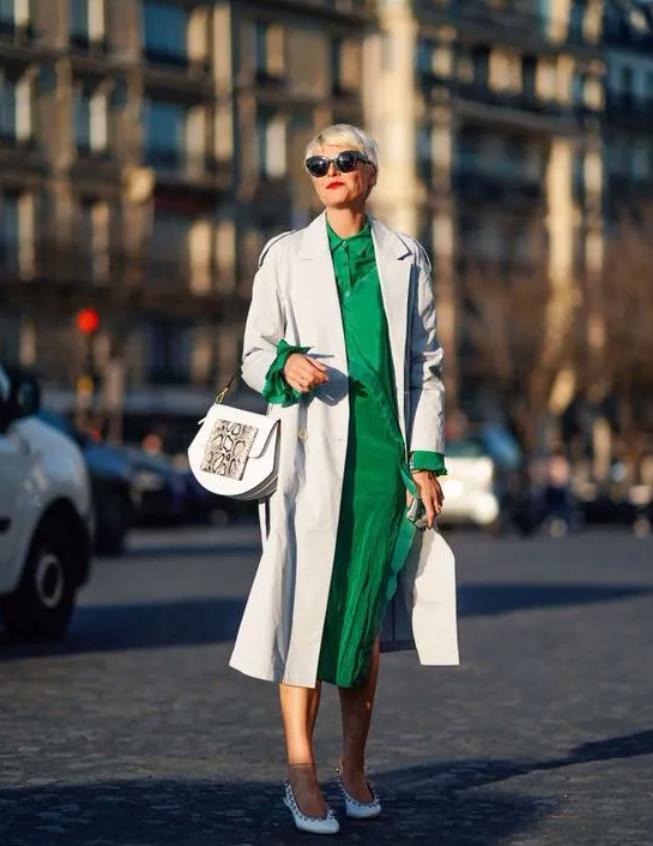 米白色的風衣,也是很經典和百搭的,內搭一件綠色連衣裙,將青春活力的氣息都拉滿了,更展現出大女人的大方和氣質,搭配上一雙白色高跟鞋,就散發出一種不經意的知性和魅力,獨立自主。
