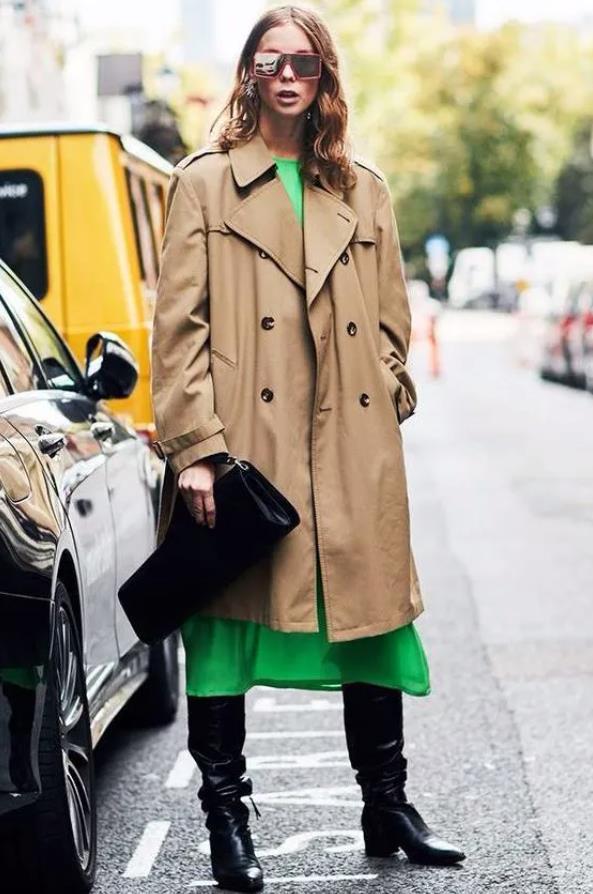 卡其色的風衣,想必在很多女性們的衣櫥裏都不會缺少吧?這種經典且充滿氣質的顏色,並不會那麼容易過時,內搭一件綠色連衣裙,很好將女人的自信和氣質演繹出來,也打造了時尚大氣感,搭配一雙黑色靴子,又毫不費力展現出颯爽,更營造出剛柔並濟感。