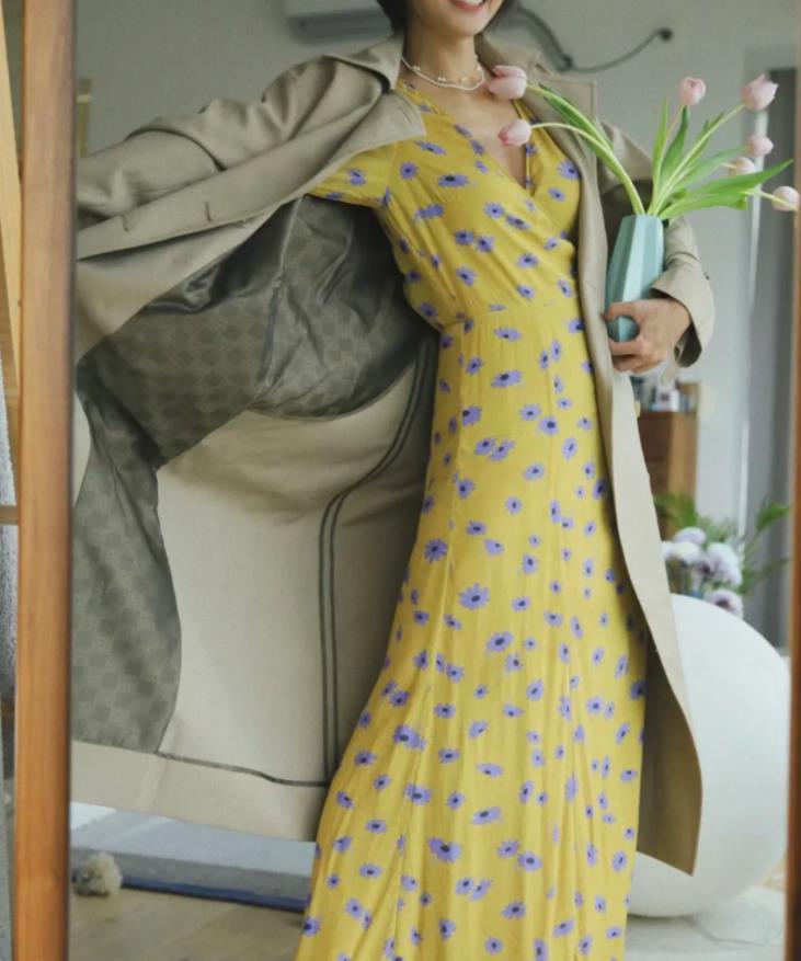 淺卡其色風衣,內搭一條黃色碎花連衣裙,這樣的搭配真的很出彩呢,帶點復古學院風的氣息,也盡顯青春與活力,更能將成熟女人的復古魅力都呈現出來,如果你喜歡這樣的穿法,那麼就試試看吧!