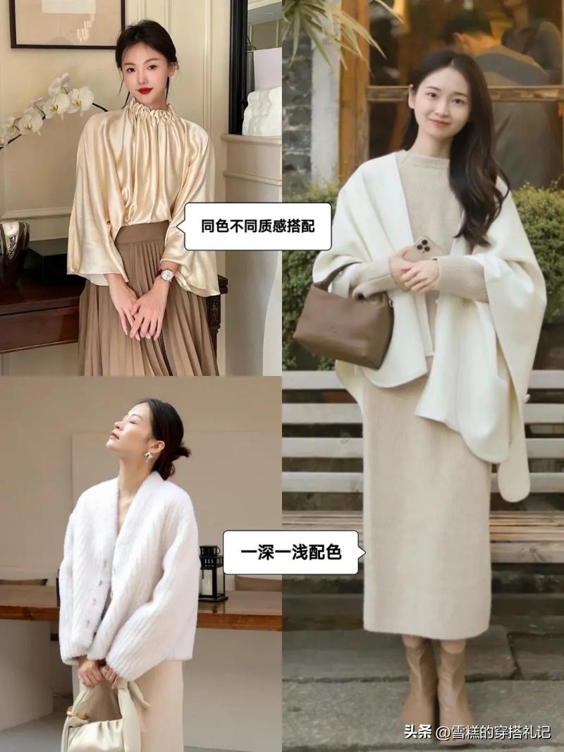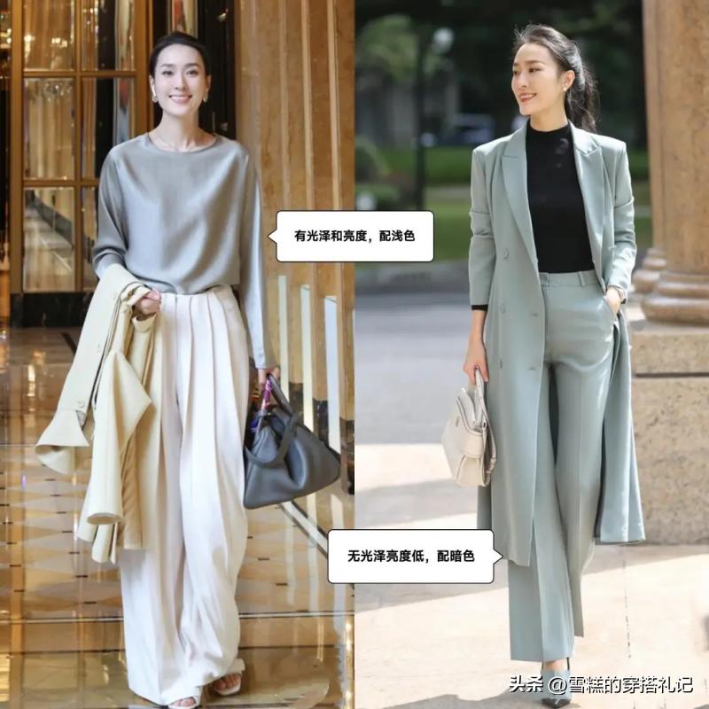 色彩和服裝面料之間,擁有着相輔相成的效果,具備一定光澤感的絲綢材質,更適合跟淺色系進行組合,能夠輕鬆穿出高貴氣質。無違和光澤感的啞光感面料,則很適合跟暗色搭配,低調又不失高級感,在做色彩組合之中,同時要記住不能超過三色原則。