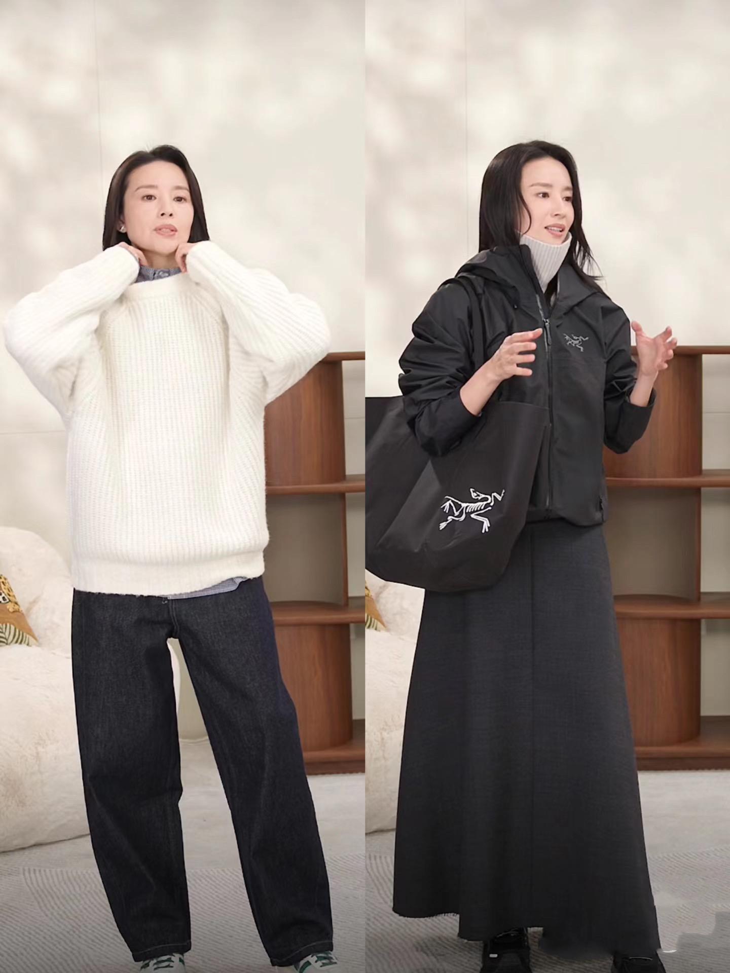 半拉鍊衛衣,很耐穿、也帶有小小的時尚感。董潔巧妙的搭配了黑色百褶裙,那種精緻與迷人,真的是太讓人心動了,原來40+的女生也可以穿裙子。