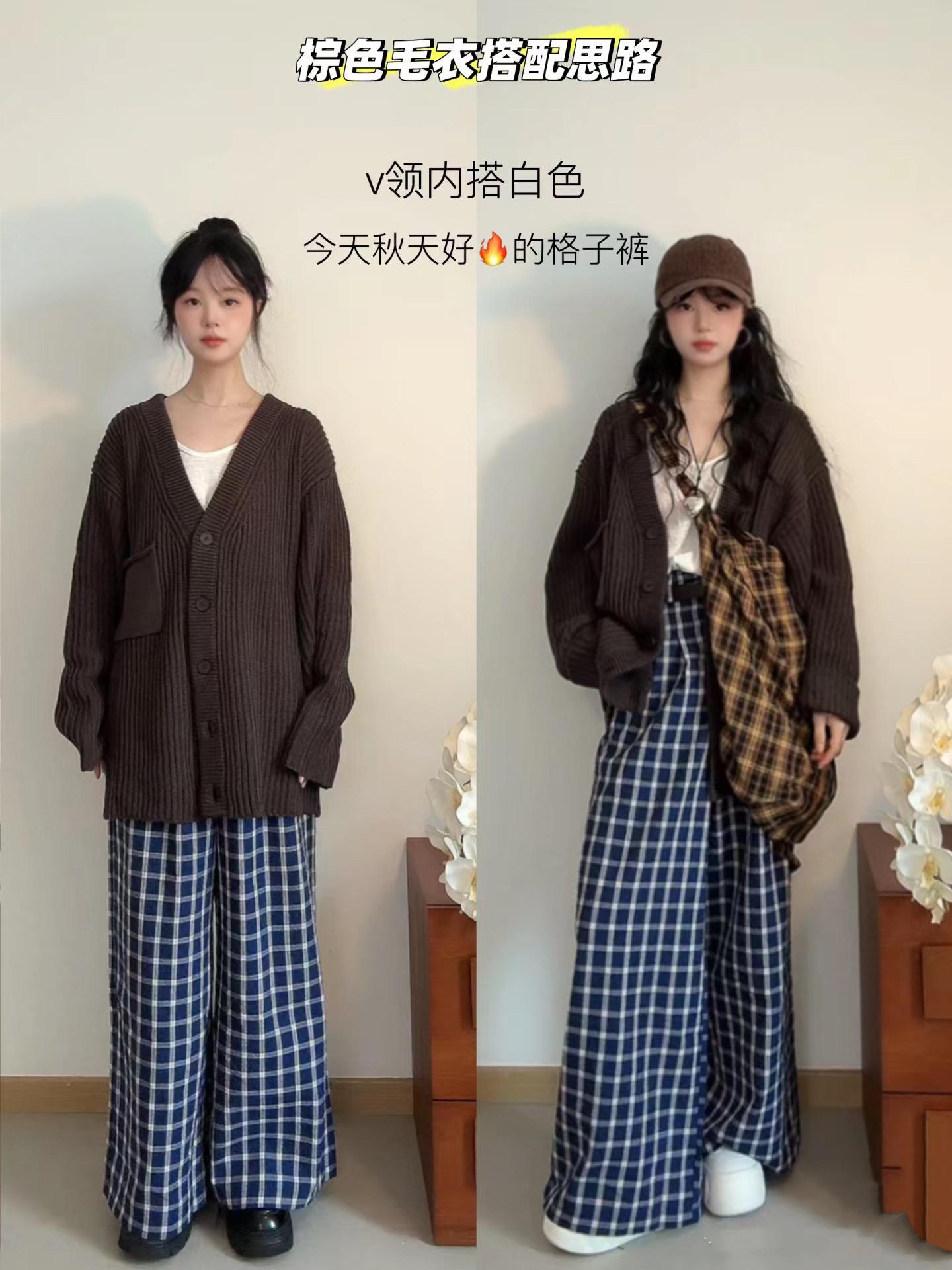 同樣還是這一件棕色毛衣,直接配寬鬆的格子褲,雖然慵懶舒適、卻也很容易表現出身材五五分的可能。