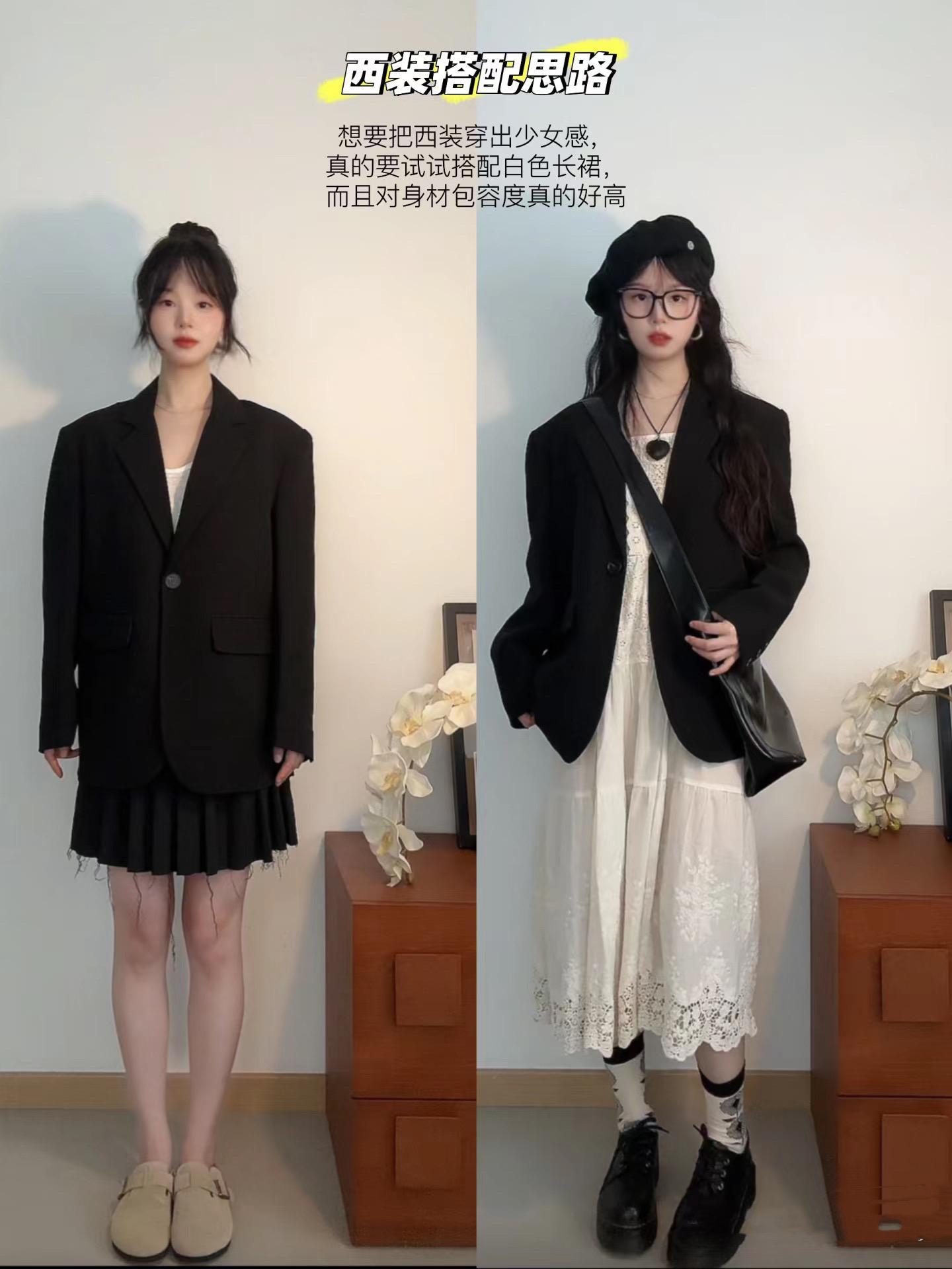 撞色的搭配,才更加醒目。一件黑色西服外套,也可以帶來不一樣的美。寬鬆的黑色西服外套,配上白色蕾絲連衣裙,又美又洋氣、還超級減齡。