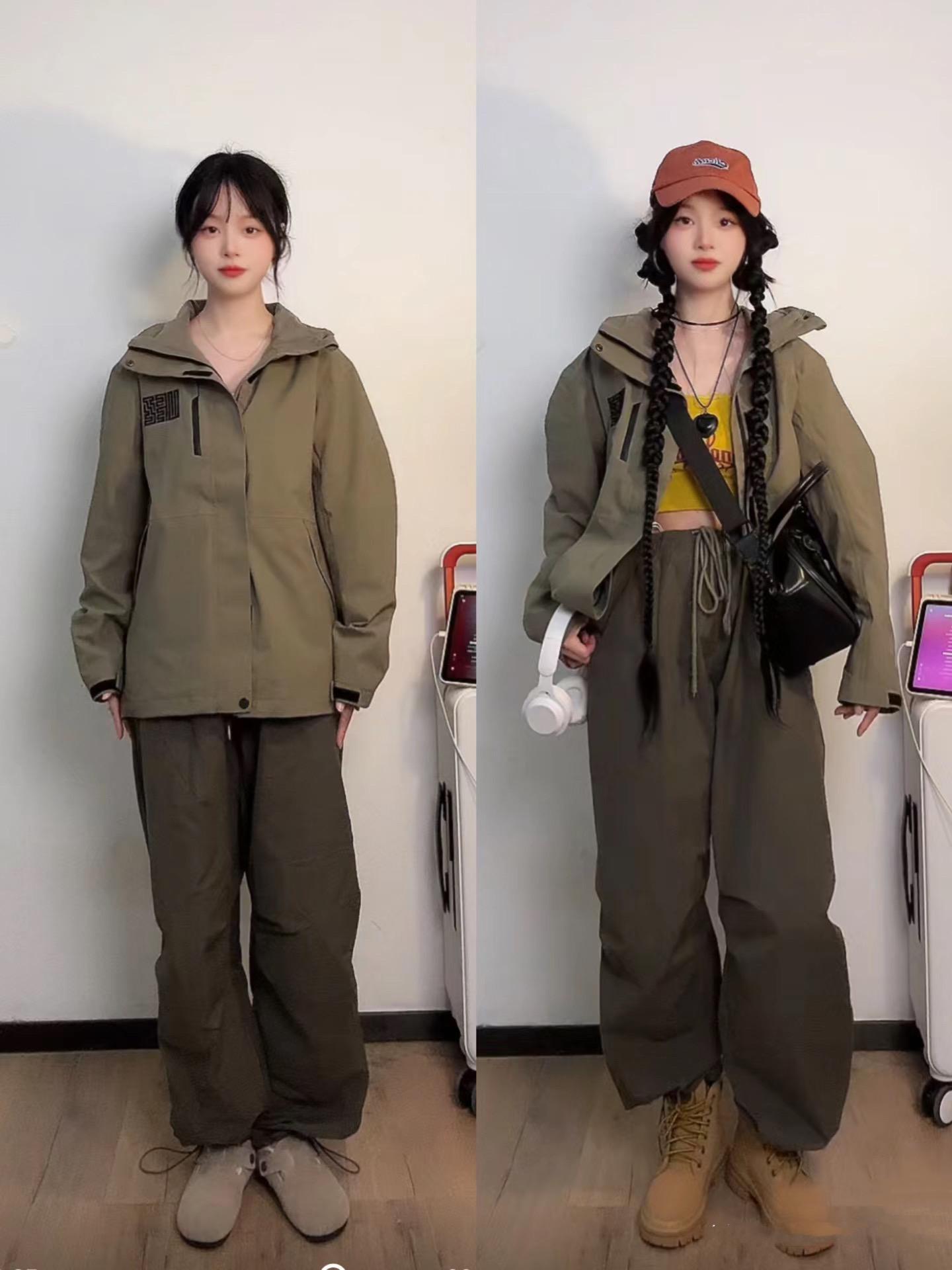 我們可以換一種新的搭配方式,將衝鋒衣的拉鍊解開,疊搭亮色系的內搭。內搭儘量配短款版型。衝鋒衣與鄰近色的高腰褲呼應,這酷颯熱辣的造型不就出來了嗎?