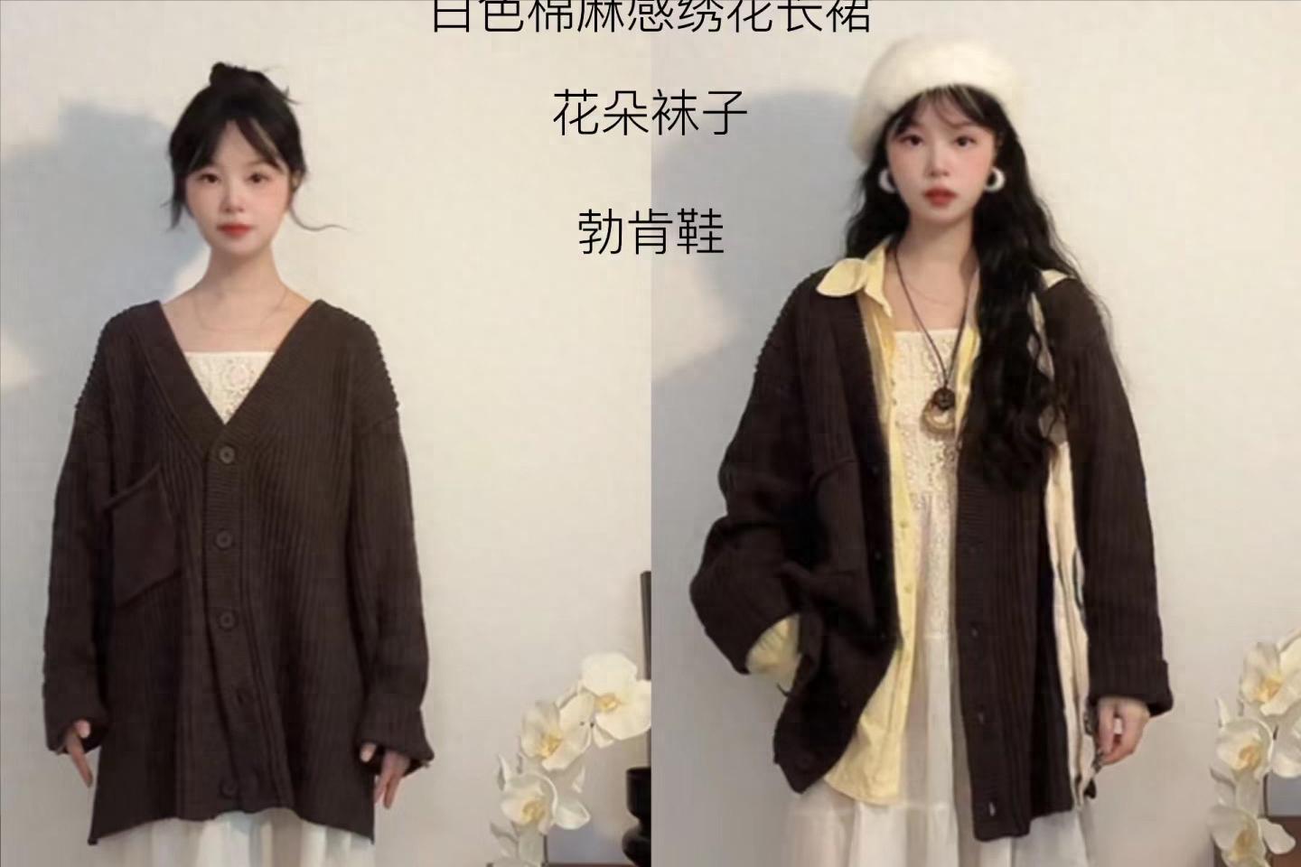 一件寬鬆休閒的棕色毛衣,直接配連衣裙穿着,是慵懶的學院風,很唯美、也很減齡,但不夠洋氣、也不夠醒目。