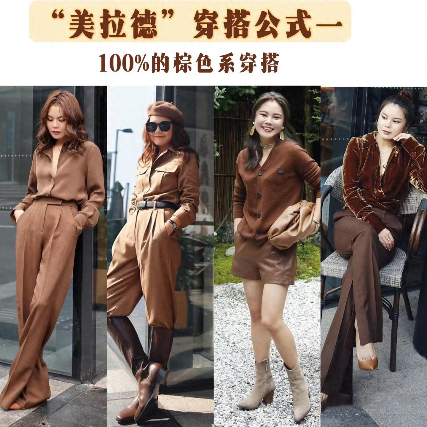 如果你線條感更清晰的搭配,可以用50%的棕色系來凸顯美拉德格調,其餘的百分之五十可以選擇鄰近色、或者高級色。