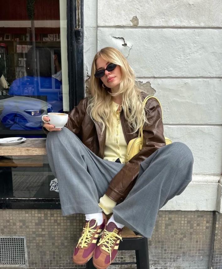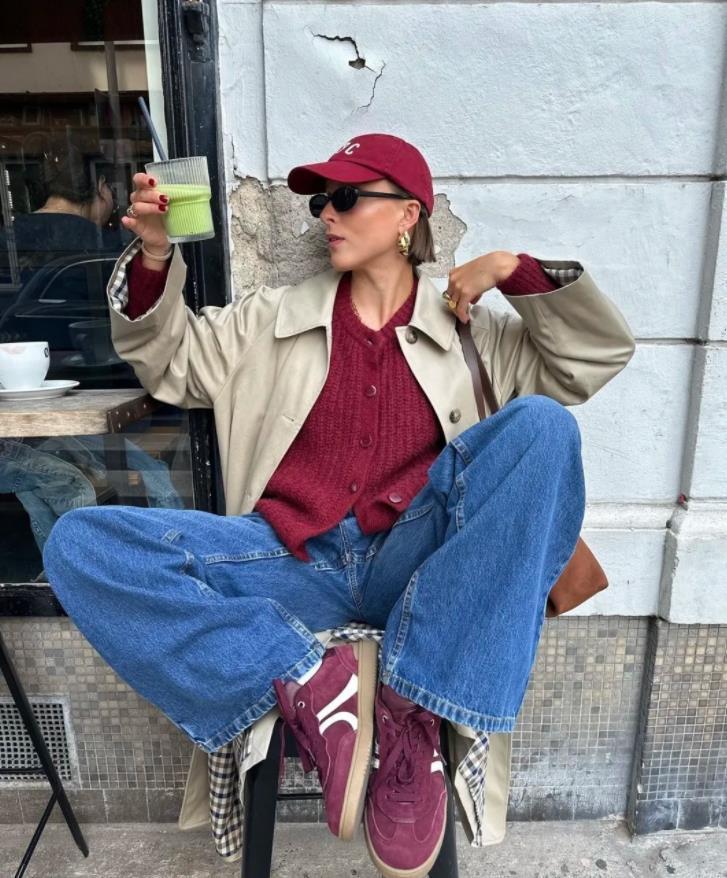 混搭也可以在德系風格穿搭中盡情演繹,淺卡其色風衣,內搭棗紅色針織開衫,如此色彩的混搭,也太出挑了,下身搭配上一條牛仔闊腿褲,爲整個穿搭增添了幾分休閒和肆意,腳下的運動鞋,顏色與內搭、帽子都一致,很好進行了色彩呼應。