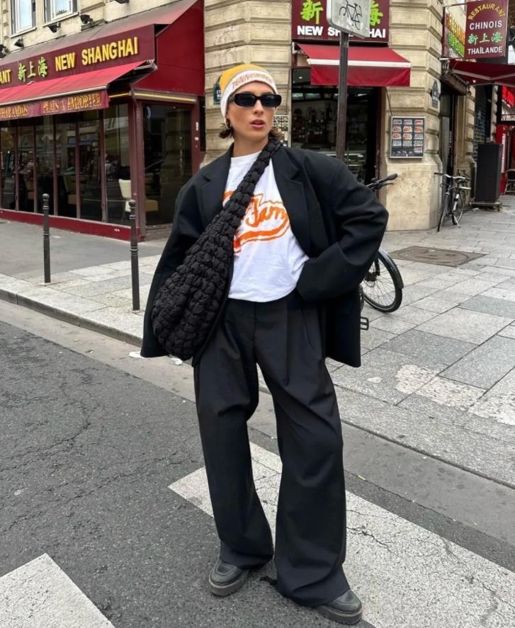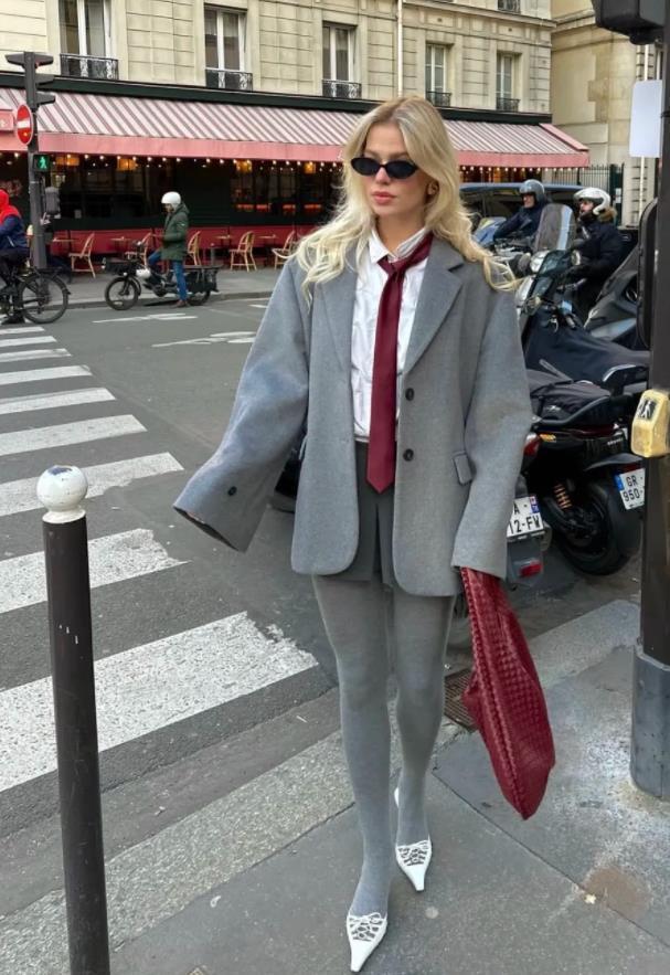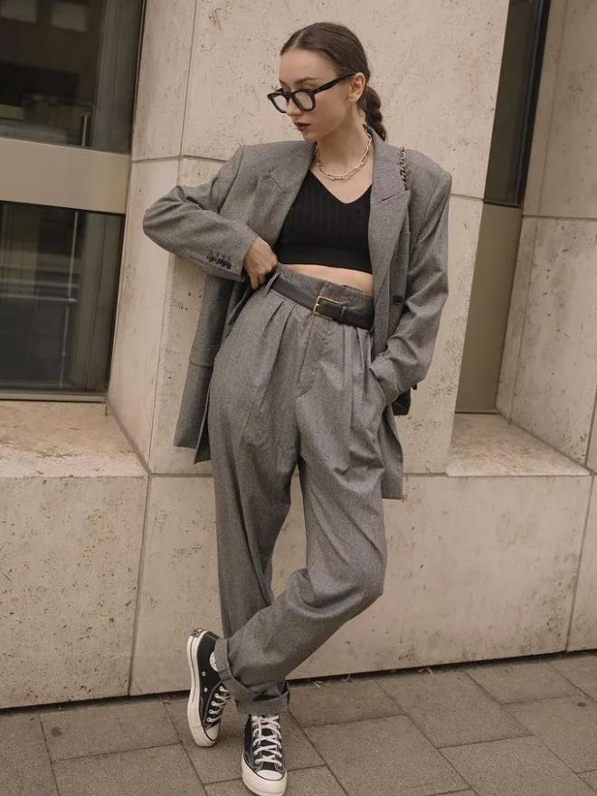 或許你會擔心這種風格自己的個子能否駕馭得了,但其實這個風格是不挑個子的,想要把德系風格的穿搭穿得出挑,技巧比身高重要,哪怕是老土的灰色套裝,你也可以通過運用一些金屬飾品來打破沉悶,再搭配上背心和帆布鞋,就很好展現出獨特的魅力。