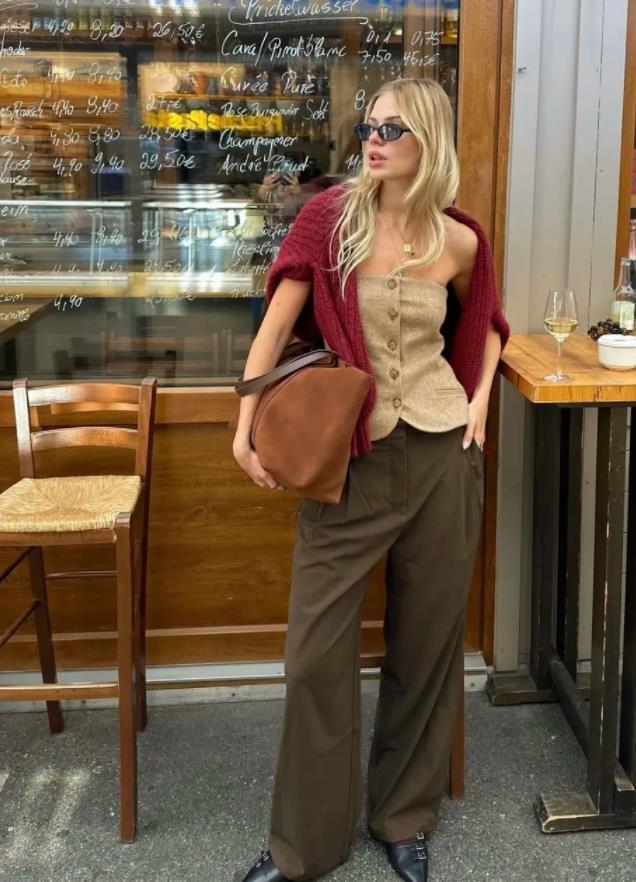 我總覺得德系風格的穿搭,有着屬於它自己的味道,性感的西裝背心,外面利用一件毛衣進行外搭,南方的女性們就可以利用起這種穿法。
