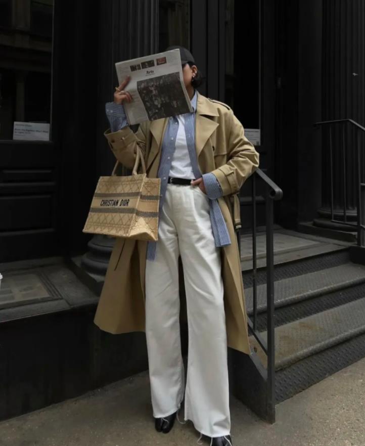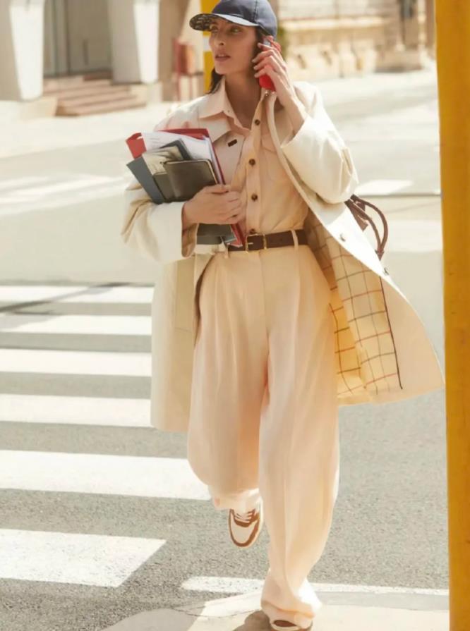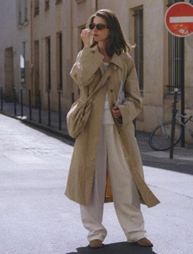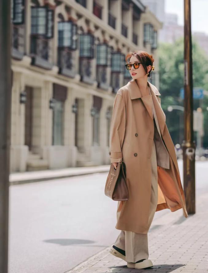 卡其色的風衣,那可是很經典的色調,可以毫不誇張地說它是時尚界裏永不過時的色調,與米白色闊腿相配,不經意間就流露出高貴與氣質。