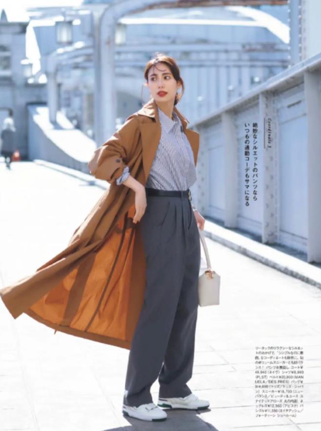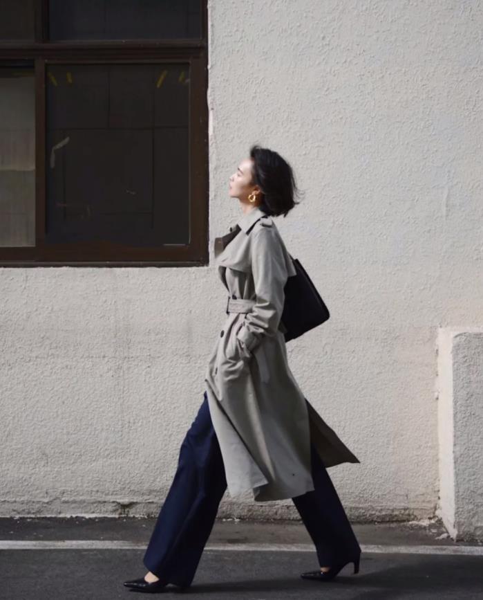 在挑選風衣和闊腿褲時,一定要注重下其材質,輕盈飄逸的面料,才能帶給你想要的效果,只要質感好,哪怕風衣和闊腿褲設計得再長,它們也不會在視覺上壓低你的個子,讓你保持一種獨立和自在的姿態。