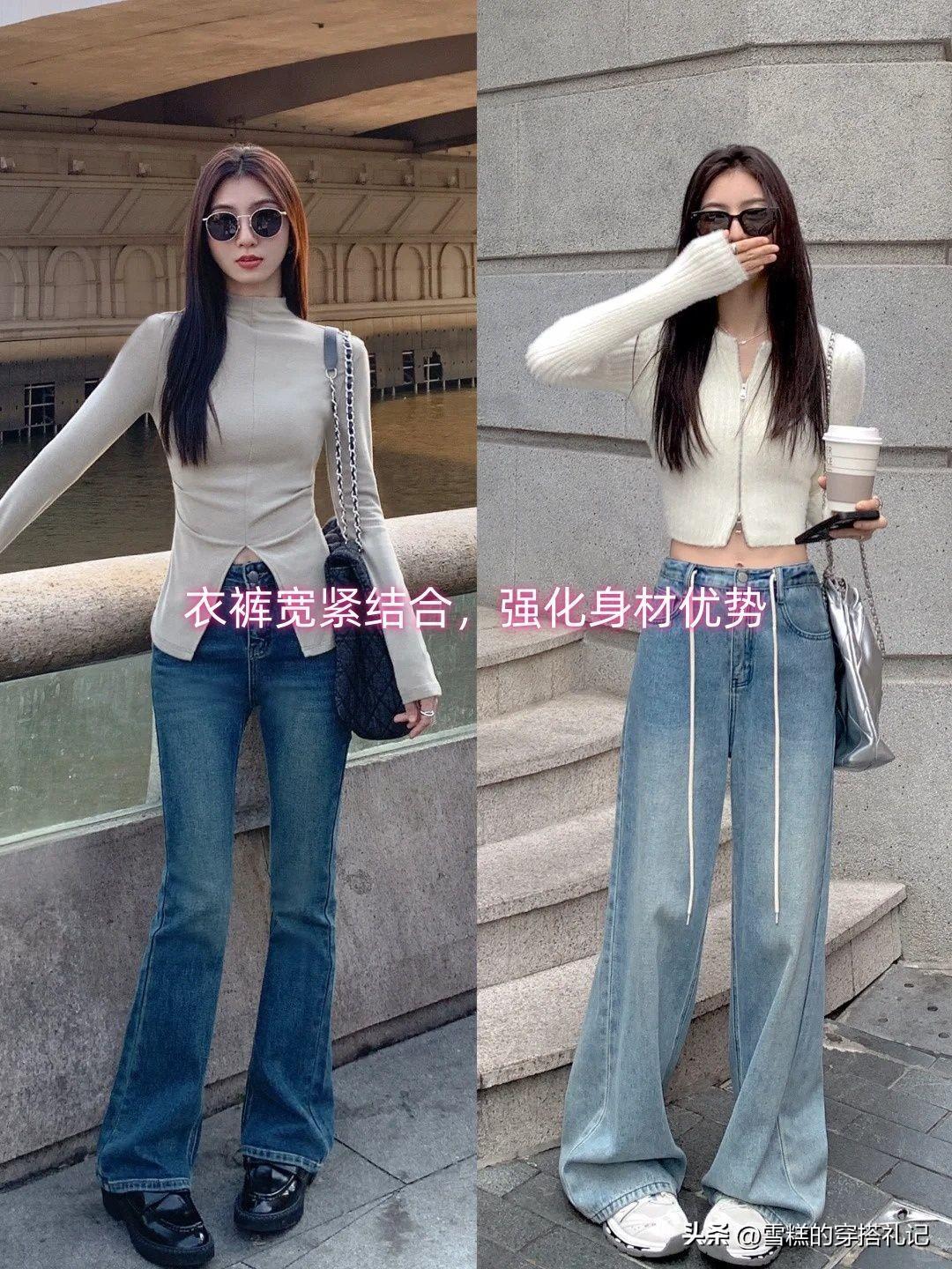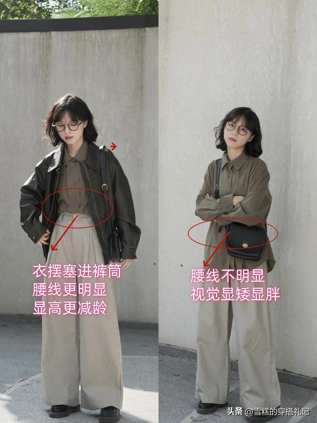 褲裝搭配最終要呈現出的效果,總是離不開顯瘦和顯高兩個目的。因此咱可以針對性進行局部的遮肉,並在此基礎上重點拉高縱向的比例調節。