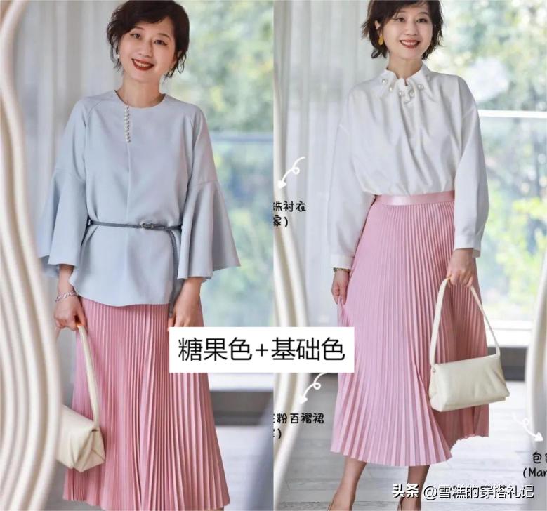 最簡單的色彩運用便是繁瑣並存,推薦使用同色系的小開襟毛衣或線條簡潔的襯衫作爲上裝基礎,然後用帶有"印花圖案"的百褶長裙來打造整體裝扮。
