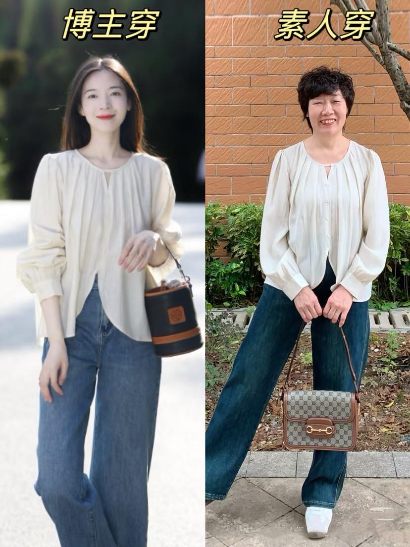 年輕博主選擇經典藍色牛仔褲,50+阿姨選擇了復古藍的牛仔褲。其實這種復古藍就更符合她的年齡定位、以及風格氣質。復古藍牛仔褲帶着年代感、也更具腔調美。