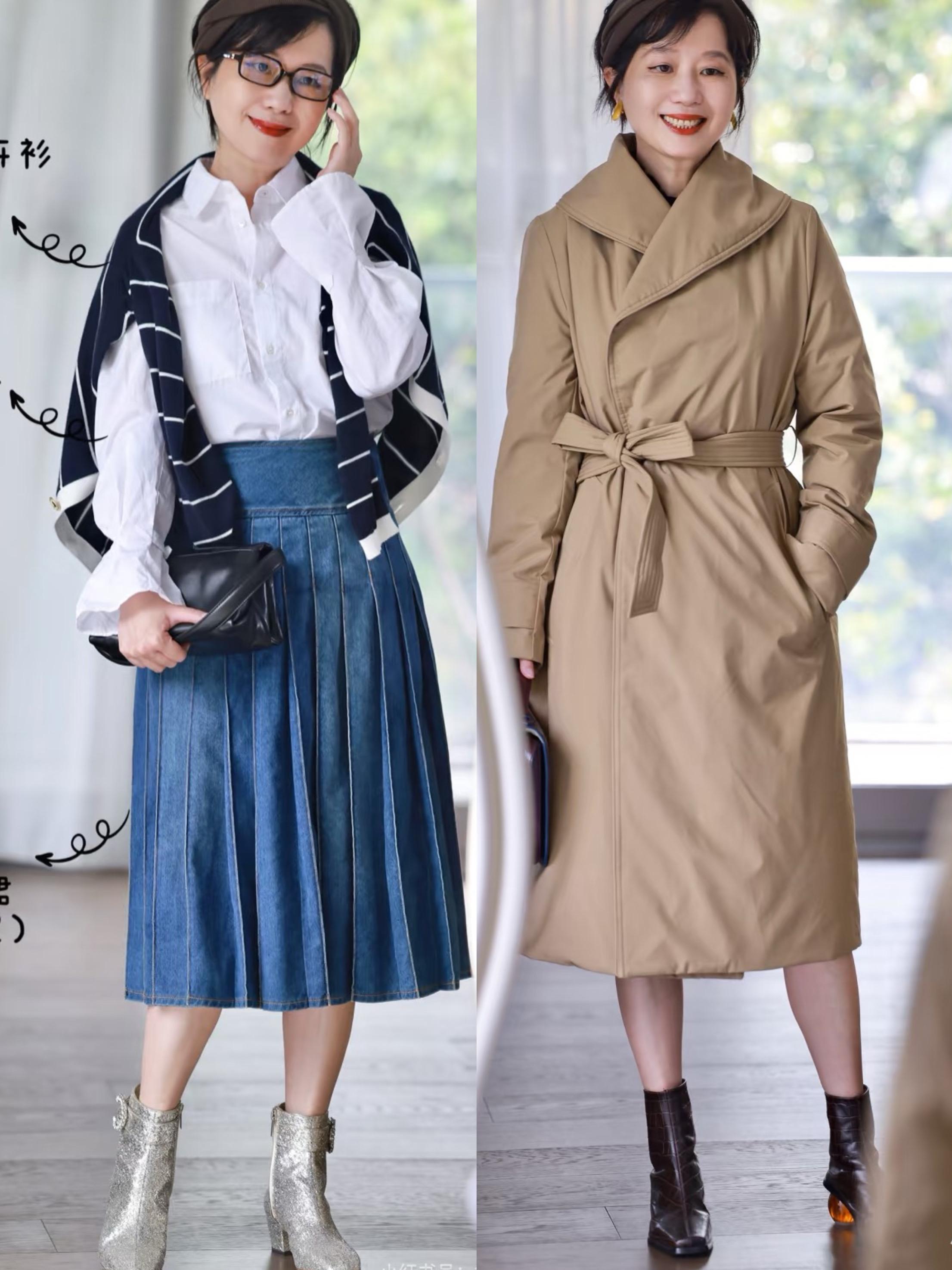 比如白襯衫、過膝裙、風衣外套、及踝短靴,利落又耐看的單品、穿起來時髦顯氣質。這種風衣+短靴的組合,多大年紀都可以輕鬆駕馭。