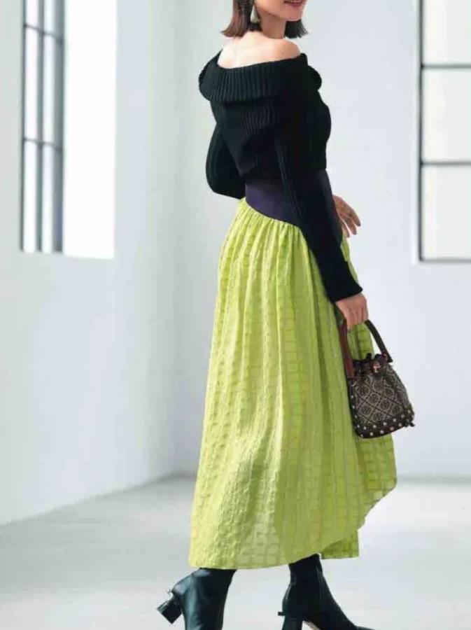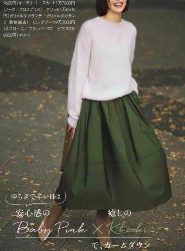 黑色毛衣和綠色的半身長裙,深色與亮色的交織,不會讓你的秋日打扮看起來沉悶了,寬大的裙襬,可是能很好遮掩住身上的缺點,也顯瘦藏肉,裙子的版型是傘字形狀的,修飾身材又帶着優雅氣質。腳下配着一雙黑色粗跟短靴,又保證了穿着溫度。