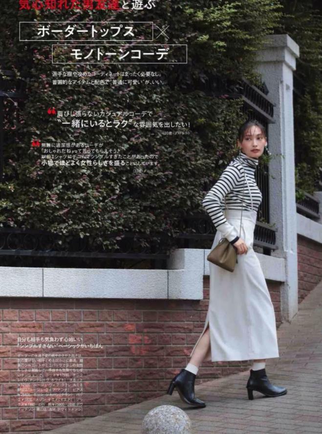 及踝的長裙搭配及踝的短靴,不經意間就展露出一絲肌膚,真的是恰到好處,白色高腰的半身長裙,把打底衫塞進裙子裏面,不僅提高腰線比例,還能在視覺上起到高挑感,加上搭配一雙粗跟短靴,保暖的同時又能塑造出女人味。
