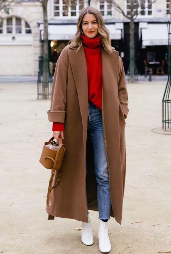 秋冬季節,選擇咖色系的單品最合適了,咖色雙面大衣,款式很簡約大氣,內搭選擇了一件高領紅色大毛衣,輕鬆點亮了整個造型。這樣的穿搭瀟灑又不失優雅,搭配一條藍色牛仔褲,又散發出一種舒適和青春的氣息,再穿上一雙白色短靴,營造出幹練利落感,還能盡情釋放獨特魅力。