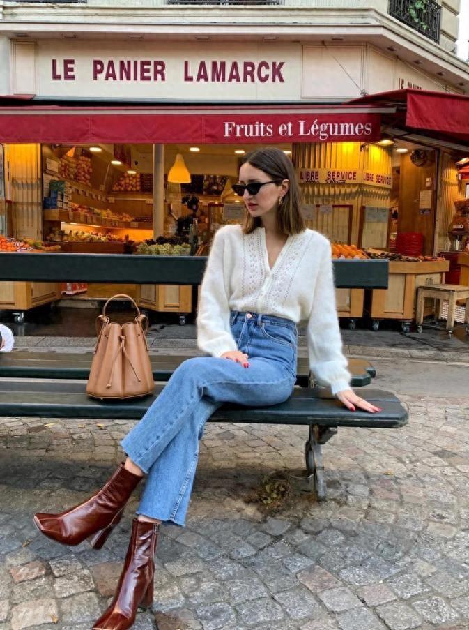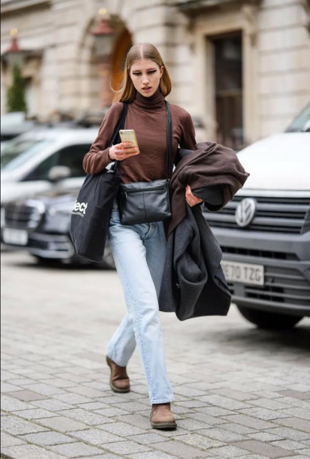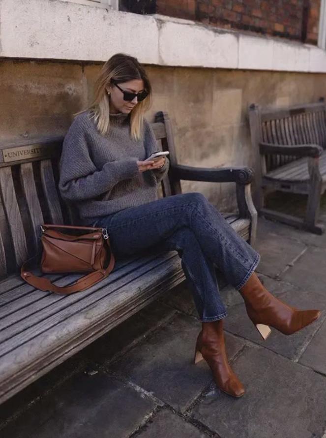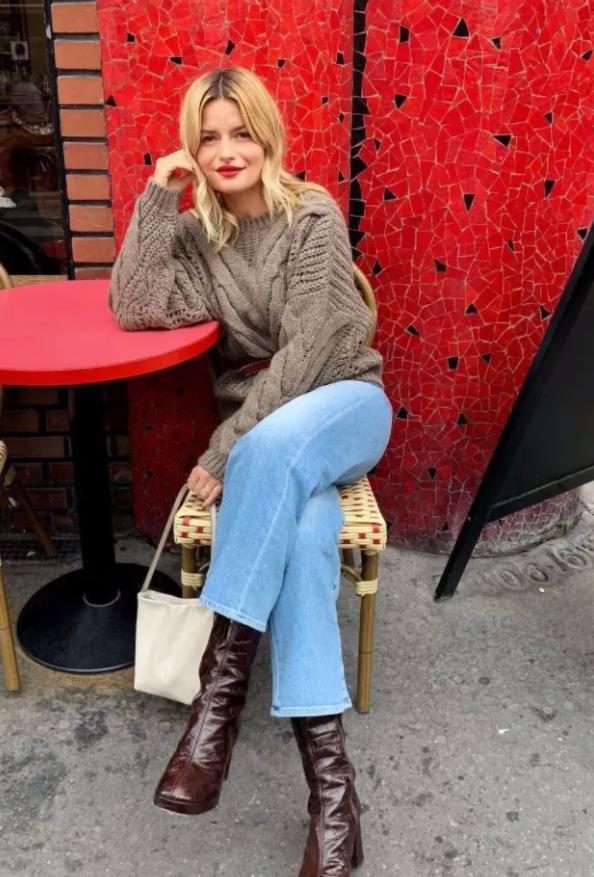 咖啡色的毛衣,給人看起來就很暖和的感覺,搭配一條藍色牛仔褲,整個着裝瞧着利落又日常,還帶着幾分不羈的魅力,搭配一雙棕色短靴,又營造出一種休閒隨性的範,視覺上也讓女性看起來更顯瘦顯高。