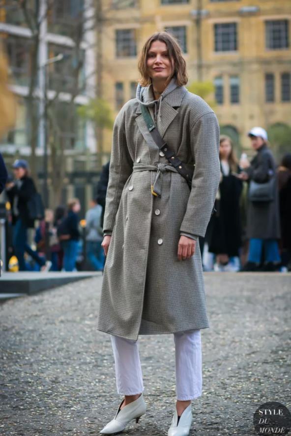 格紋繫腰帶大衣,內搭一件灰色連帽衛衣,寒冷的冬天這樣穿也不畏懼寒冷了,無形間還散發出一種女性的獨立自信,選擇一條淺藍色牛仔褲,很好展現出女性的時尚與魅力,腳下踩着一雙白色短靴,輕鬆綻放出個人魅力。