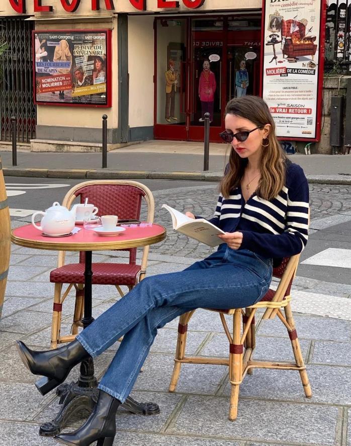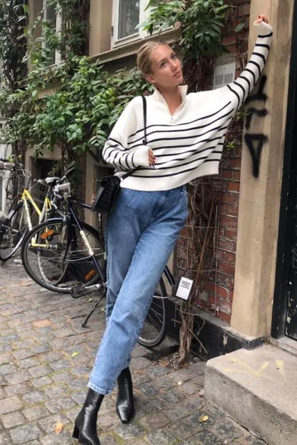 白色橫條紋polo衫,這種比純色的要時髦太多了,也充滿了個性,搭配一條牛仔褲,演繹出一份輕鬆自在,褲子的版型是直筒形狀的,修飾腿部線條又顯瘦,選擇一雙黑色靴子來配,輕鬆展現出非凡的魅力,秋天這麼穿正好。